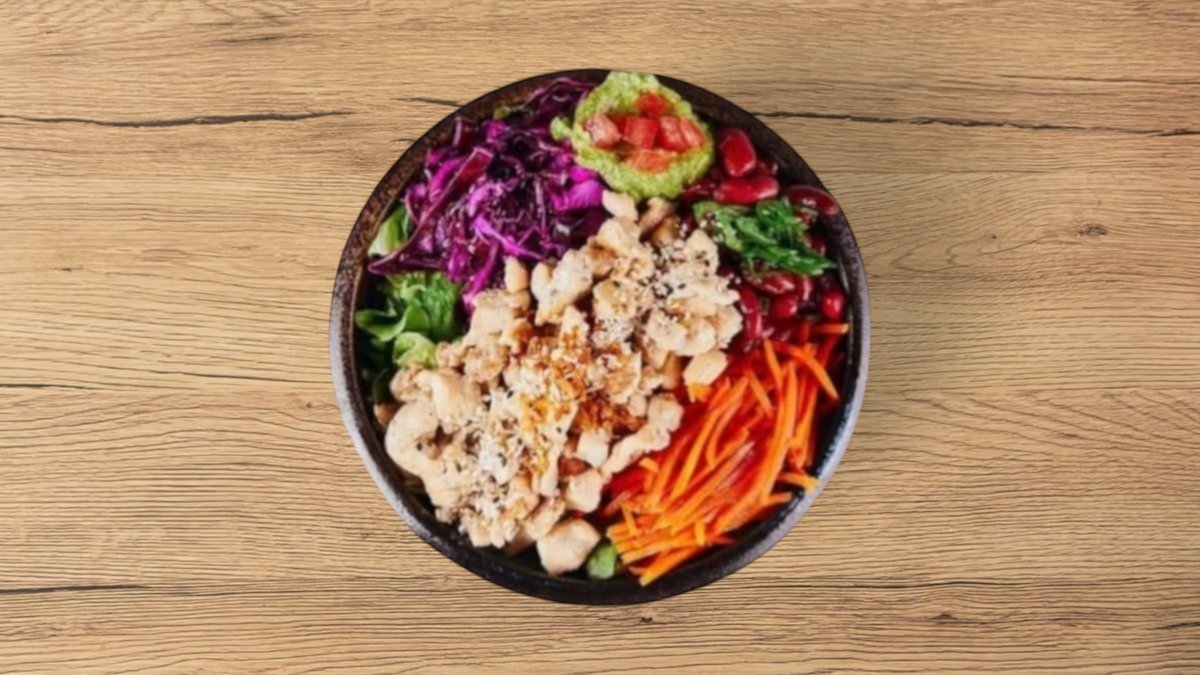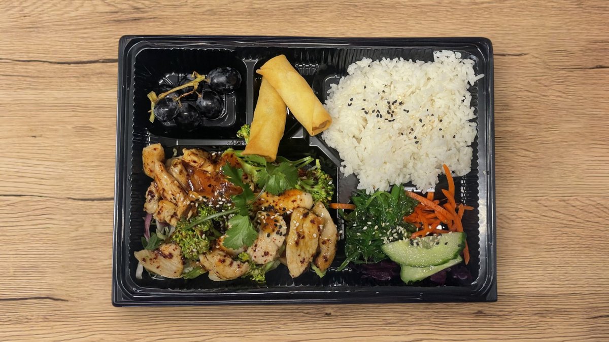 Sautéed in Korean chilli and refined with lemongrass. CONTENTS: Spring rolls, salad, rice, protein, fruit, wakame seaweed