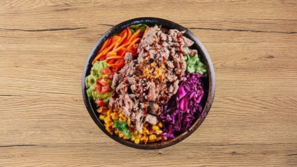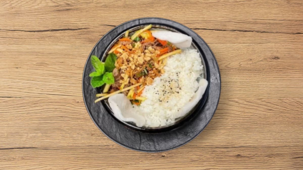 tossed Teriyaki Black Angus Beef with grooved Vietnamese-style corn, rice, various fresh pickled specialties and side salad