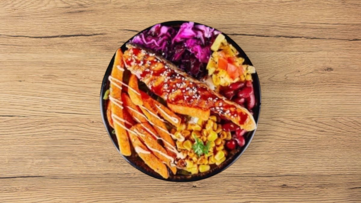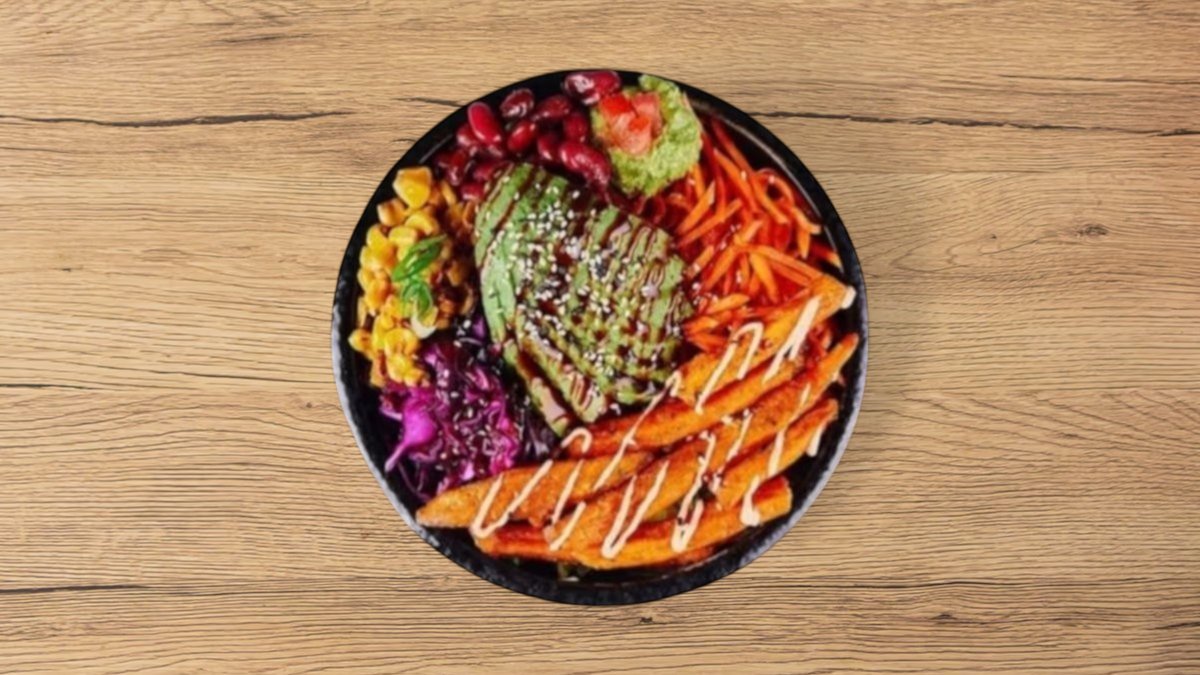 avocado flower cut with oregano sweet potato fries, rice, various fresh pickled specialties and side salad. Can be prepared as vegan, upon request