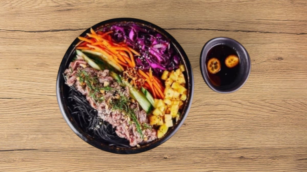 24-hour marinated beef entrecôte with homemade charcoal rice noodles and tamarind vinaigrette