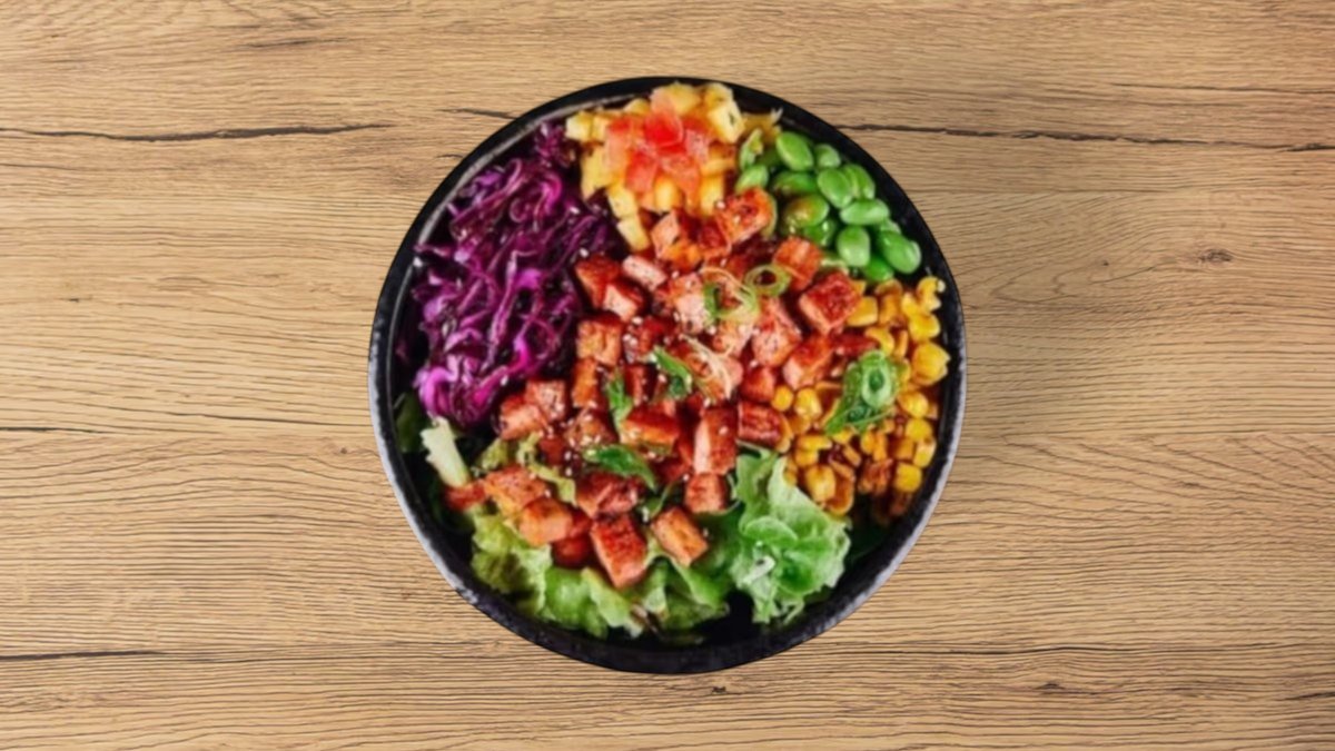 grilled tofu in our own red velvet essence with rice, various fresh pickled specialties and side salad