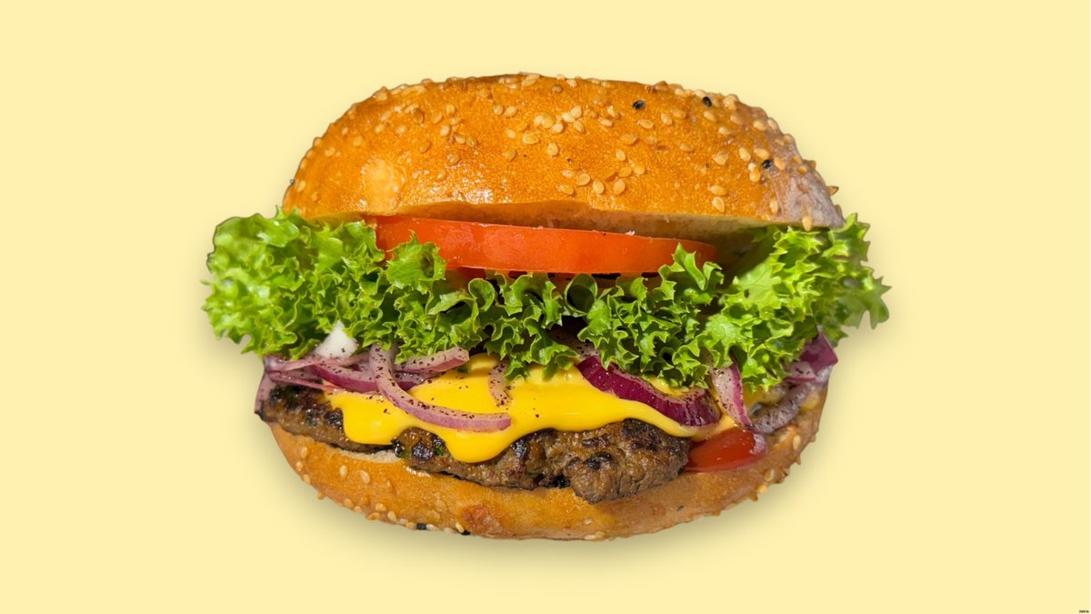 mit Smashed Köfte Burger Patty vom Rindfleisch, eine Käsescheibe, Ketchup, Mayonnaise, Samurai-Soße, Olivenöl, roten Zwiebeln, Salat und Tomaten in leckerem, getoastetem Fladenbrot und Bauernbutter angepinselt
