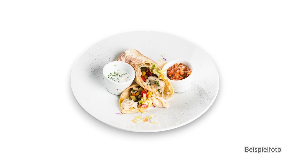 Colombian burrito with avocado sauce (slightly spicy), Cheddar cheese, mozzarella, oven-roasted pork, Batavia salad, corn, pico de gallo, pink sauce and French fries