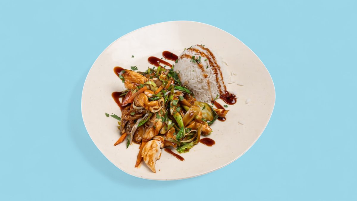 with tender chicken strips, vegetables, rice and teriyaki sauce