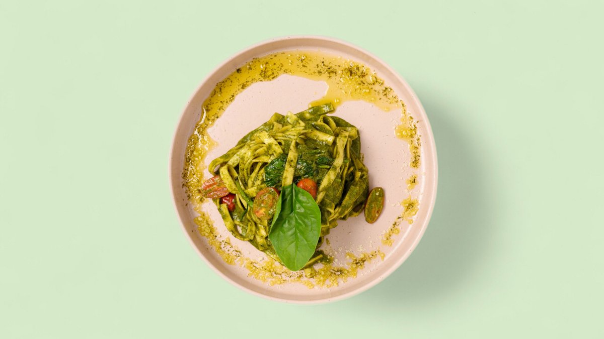 cremige Sahnesoße mit Baby-Blattspinat, fruchtigen Kirschtomaten, hausgemachtem Basilukm-Pesto und geriebenem Grana Padano