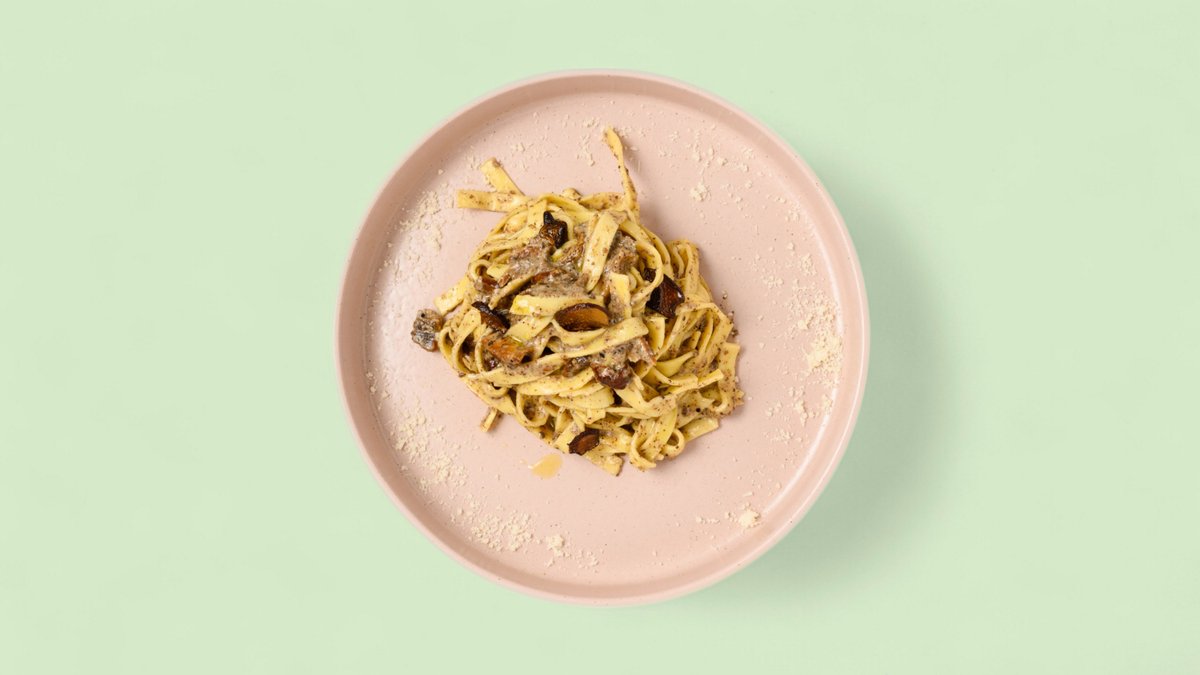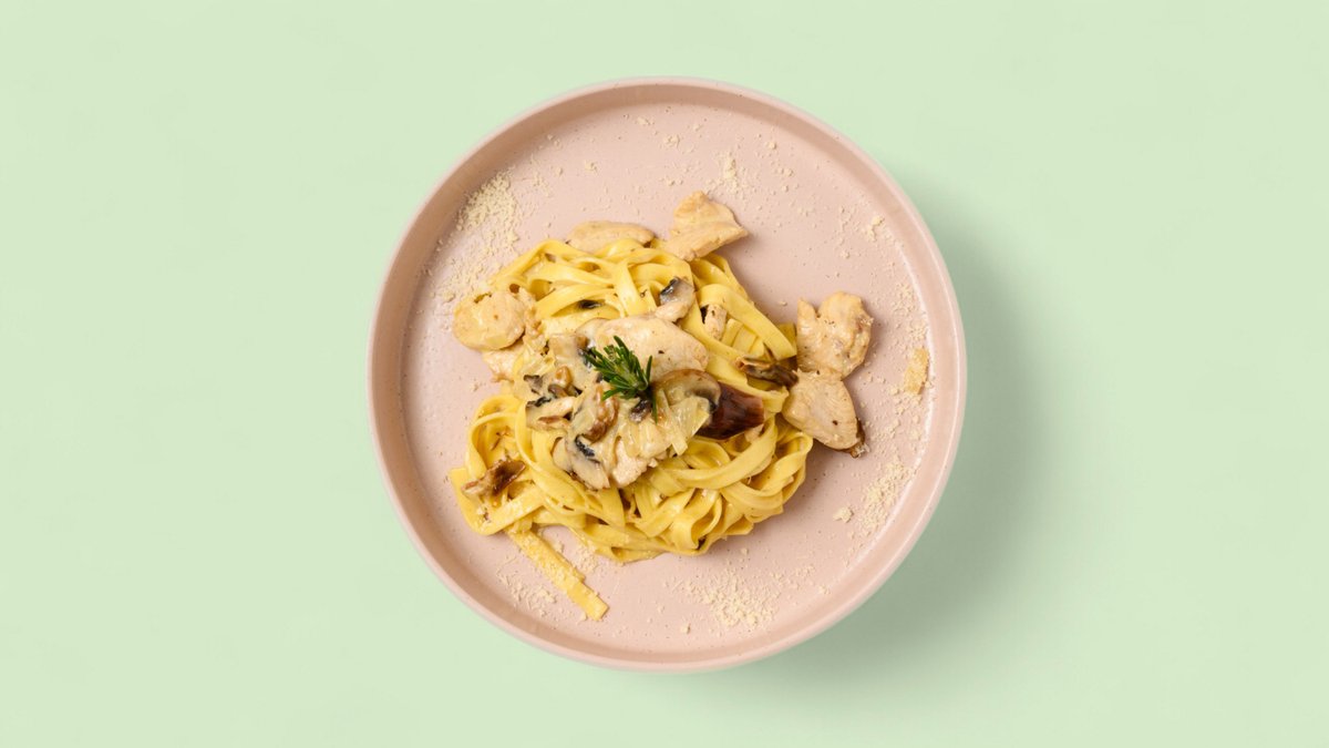 cremige Sahnesoße mit Champignons, Steinpilzen, Hähnchenbrustfilet, karamelliserten Zwiebeln und frischer Petersilie
