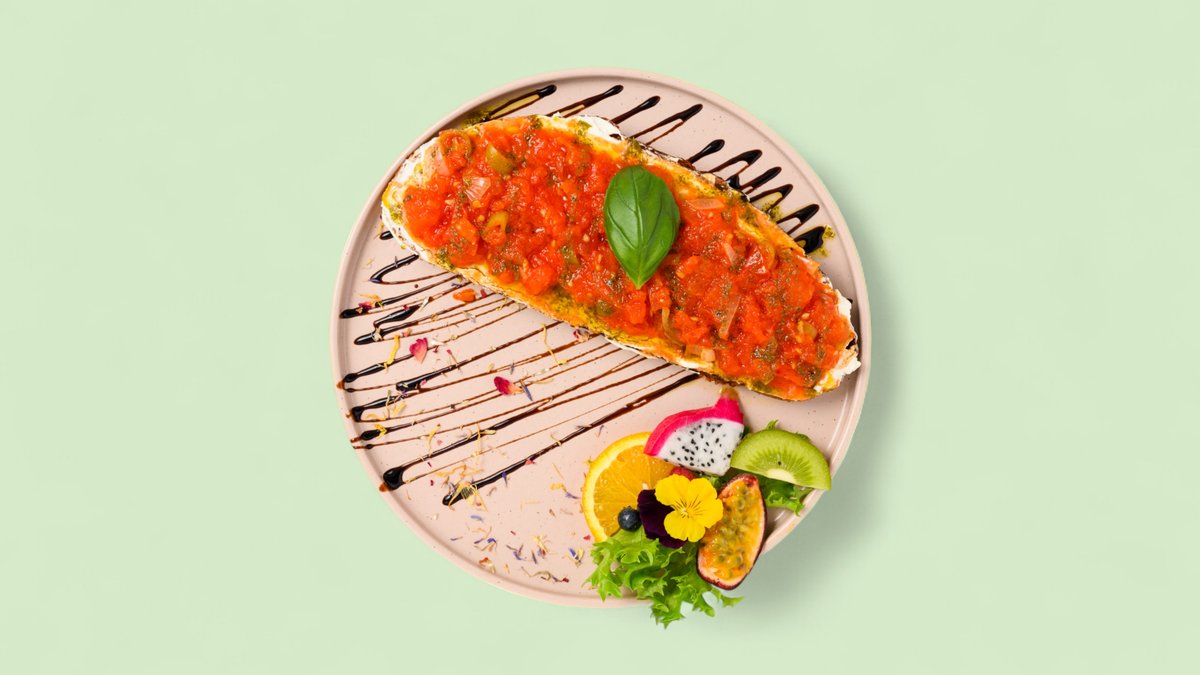 mit Sauerteigbrot, Ricotta Creme hausgemachter Tomaten-Salsa und Pesto-Dressing