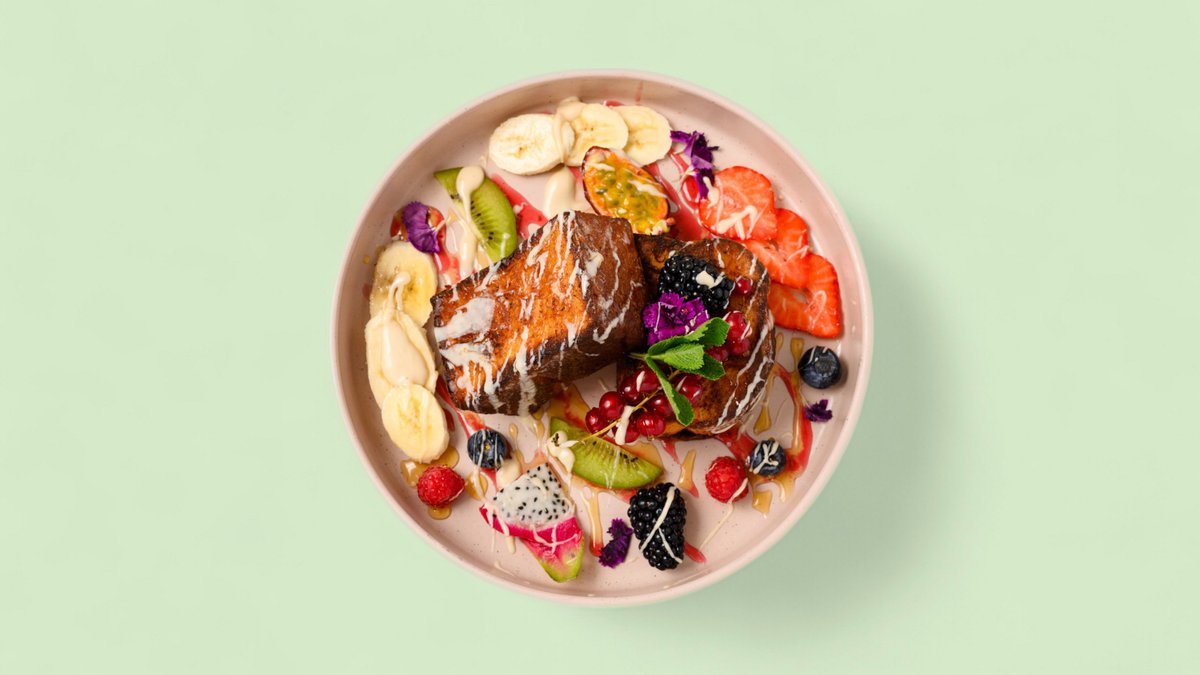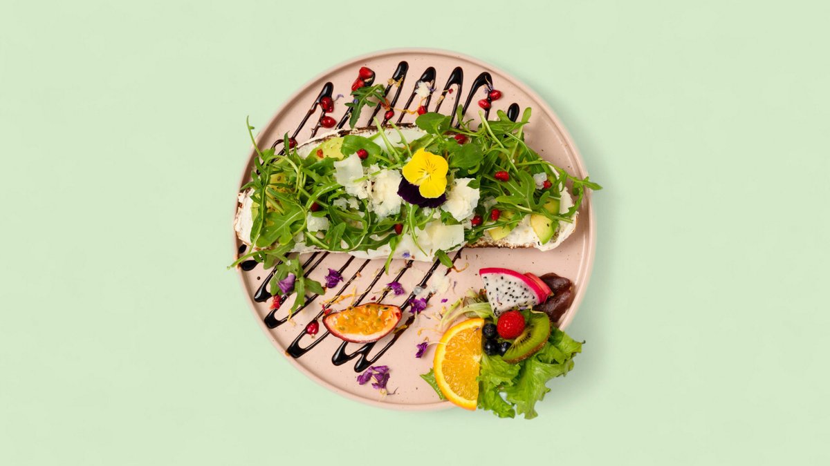 mit Sauerteigbrot, Frischkäse, Avocado, Spiegelei, Rucola und Parmesan
