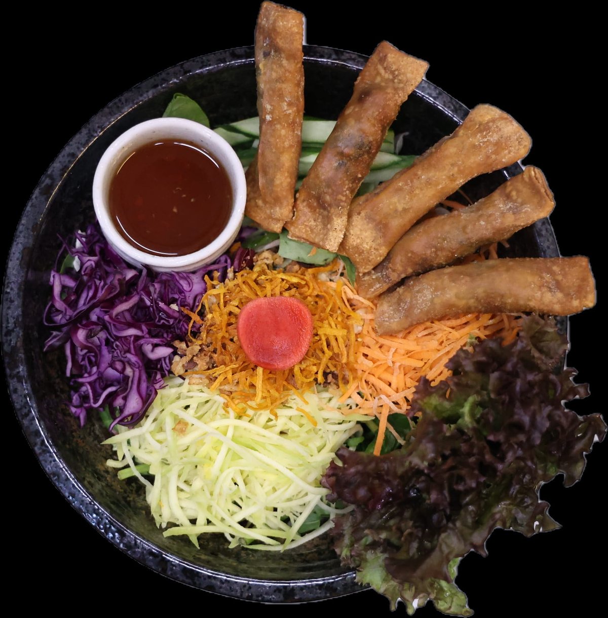 vietnamesischer Nudelsalat mit knusprigen Frühlingsrollen, verschiedenen frischen grünen Salaten, Mango, Karotten zusammen mit gerösteten Zwiebeln, gerösteten Erdnüssen und Chili-Knoblauchsoße