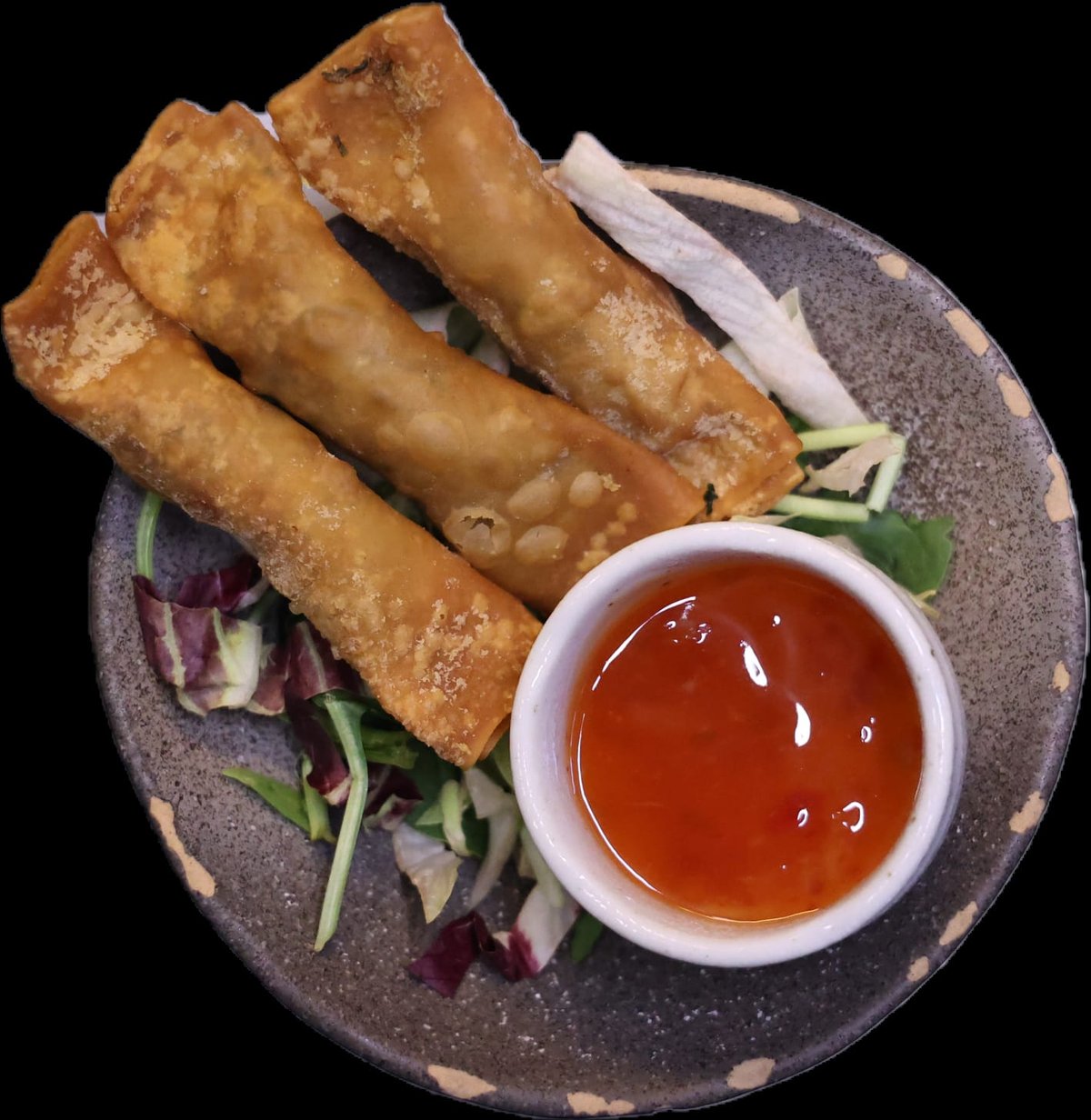 hausgemachte knusprige Frühlingsrollen gefüllt mit Kartoffeln, Seetang und Mais, serviert mit Himbeer-Chilisoße