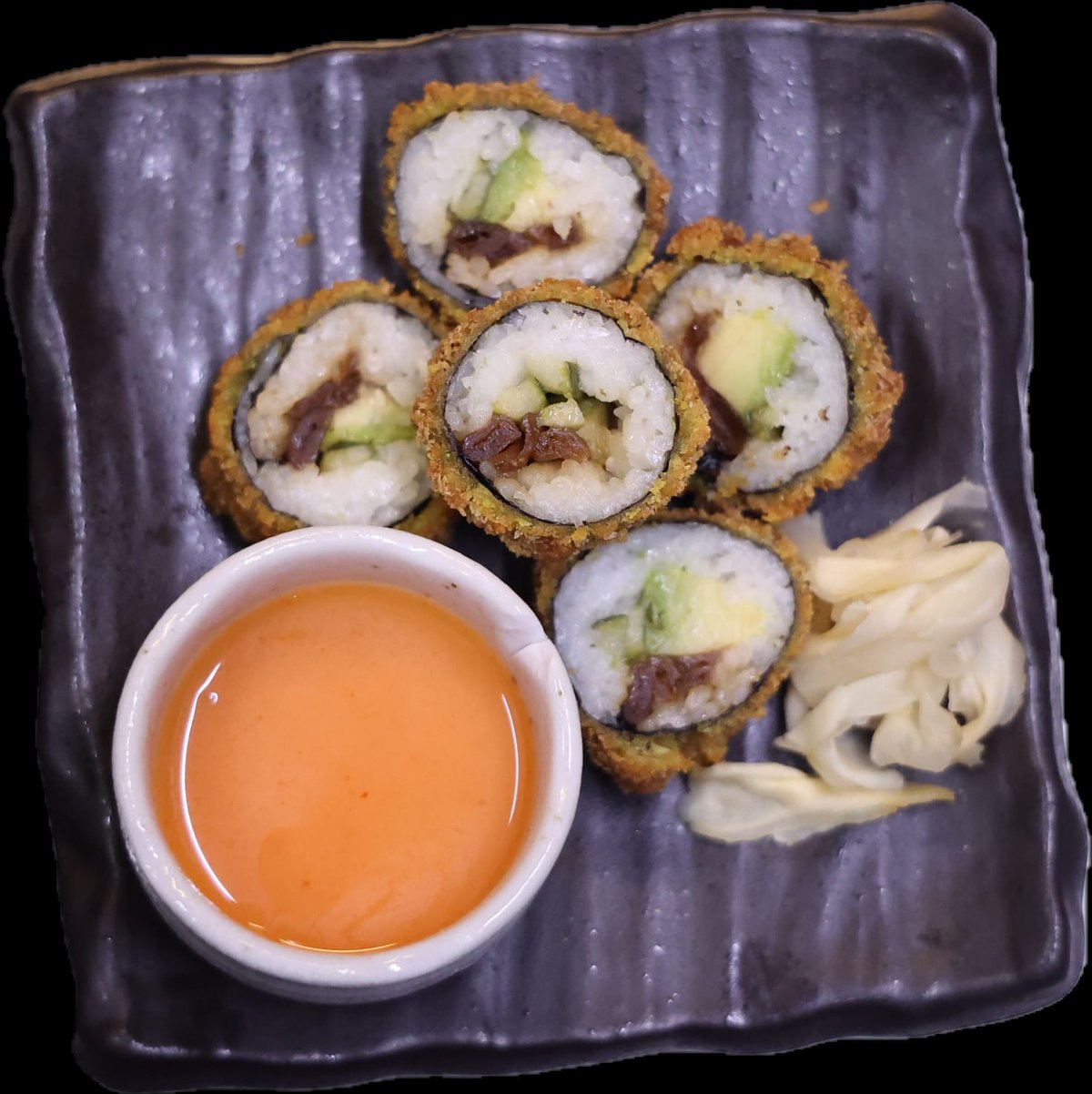 frittierte Sushi mit Avocado, Gurken, gelb eingelegtem Rettich und Teriyaki-Soße