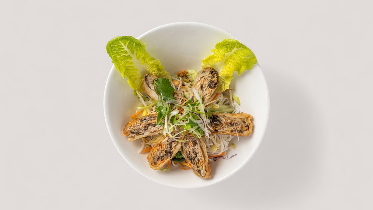 Frühlingsrollen gefüllt mit Gemischtem Hackfleisch vom Rind und Schwein, Reisnudeln, Limetten Vinaigrette, Erdnüsse, Salat und Röstzwiebeln