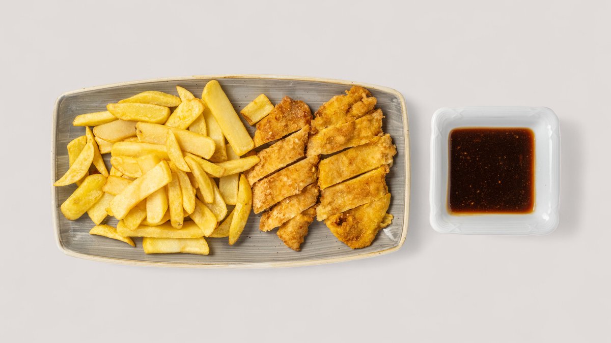 knuspriges Hühner 'Schnitzel' mit Pommes, hausgemacht und pikante Soße