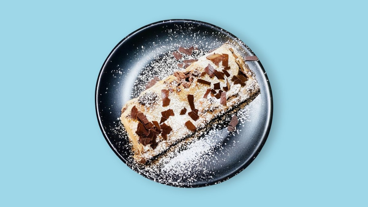 Knusprig gebackener Teig frisch aus dem Ofen mit wahlweise feiner Zartbitter 70% Schokolade (Lindt) oder "Kinder Bueno" Schokoriegel und Mascarpone Creme gefüllt. Außen mit Puderzucker bestreut und Schokoraspeln garniert.