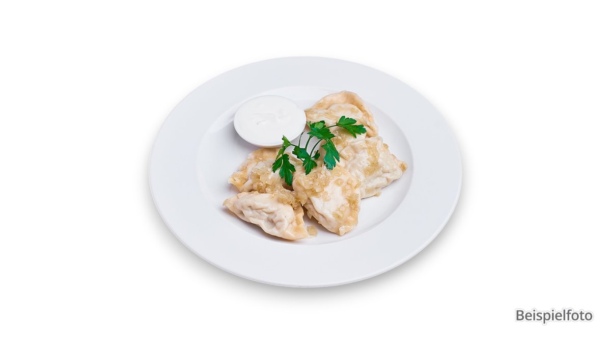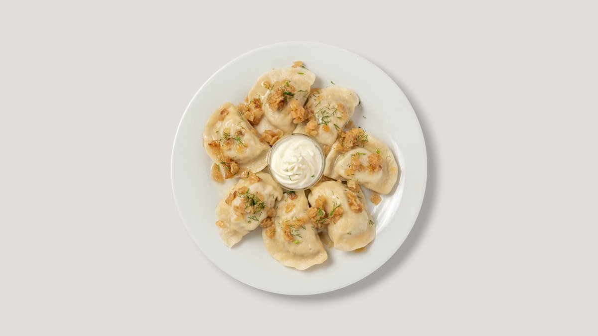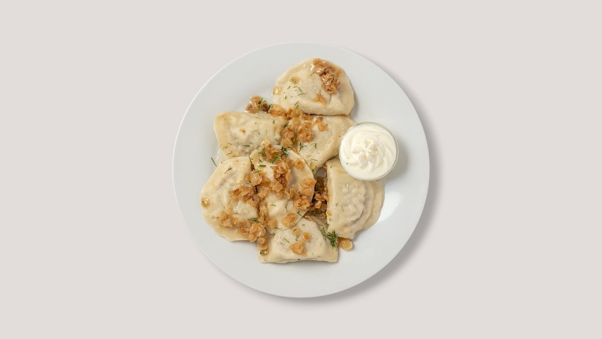 homemade dumplings with sauerkraut and mushroom filling, sautéed onions and sour cream sauce