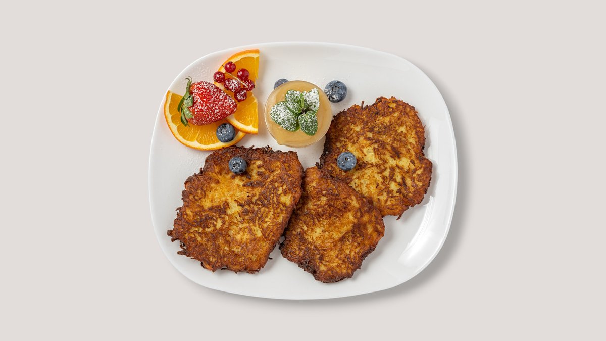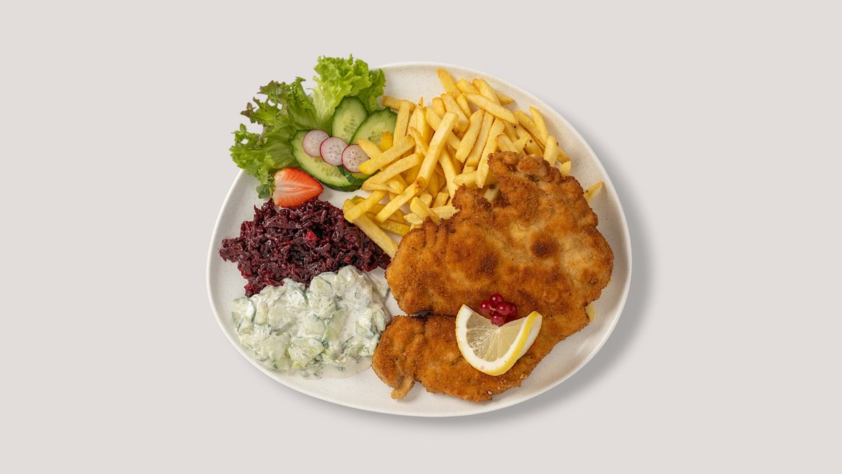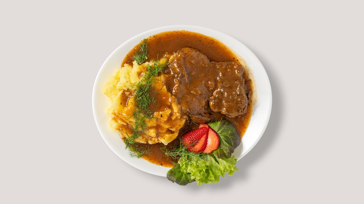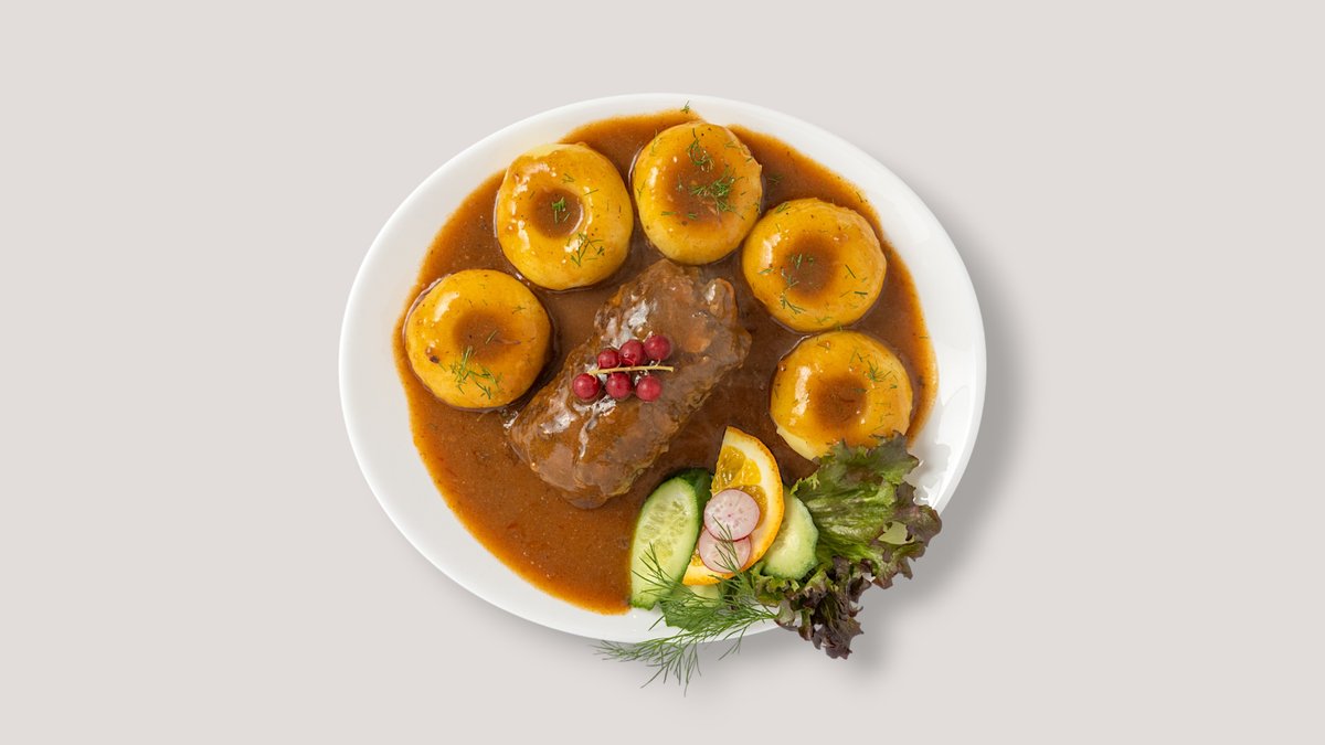 filled with classic beef roulade, cucumbers, bacon, onions and a side dish of your choice