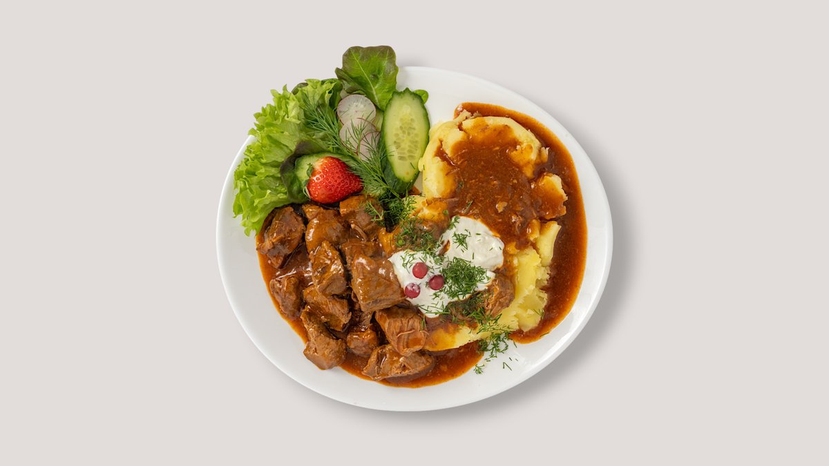 with hearty pork goulash in a spicy sauce and a side dish of your choice
