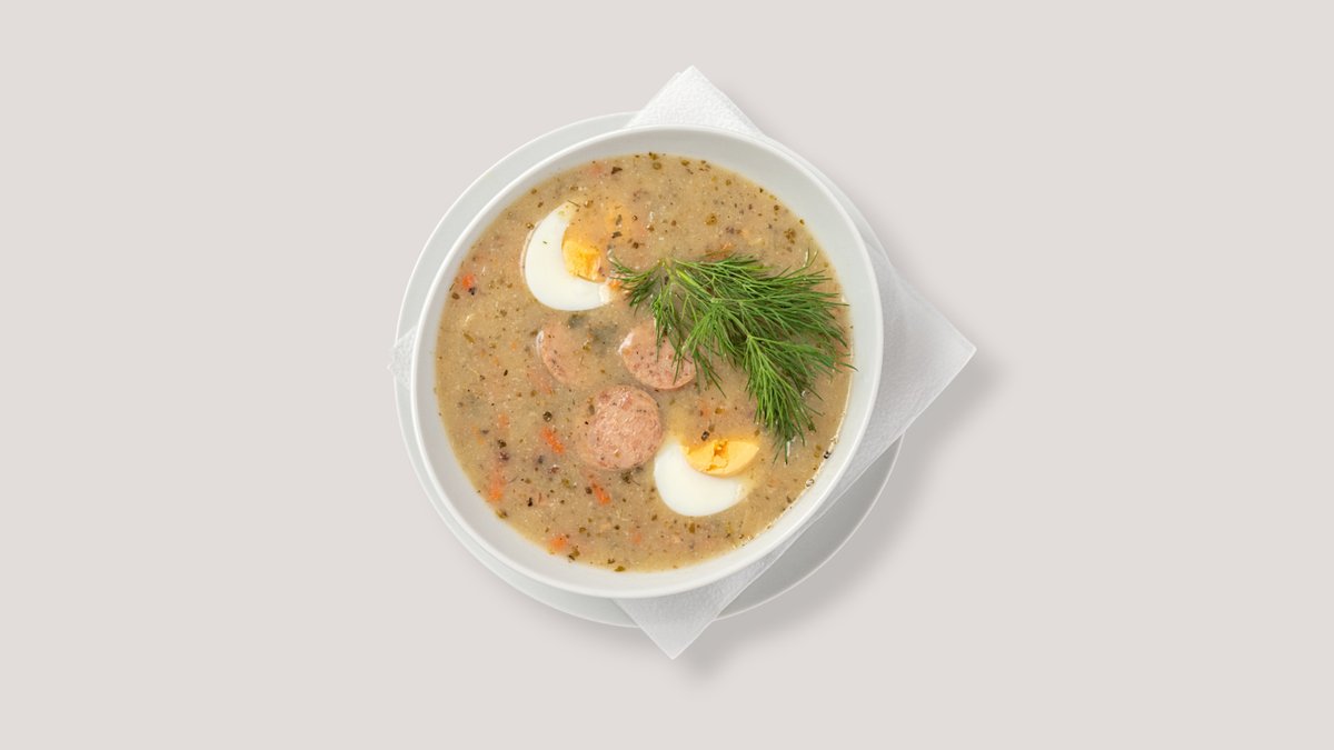 hearty and sour flour soup with pieces of pork sausage and eggs