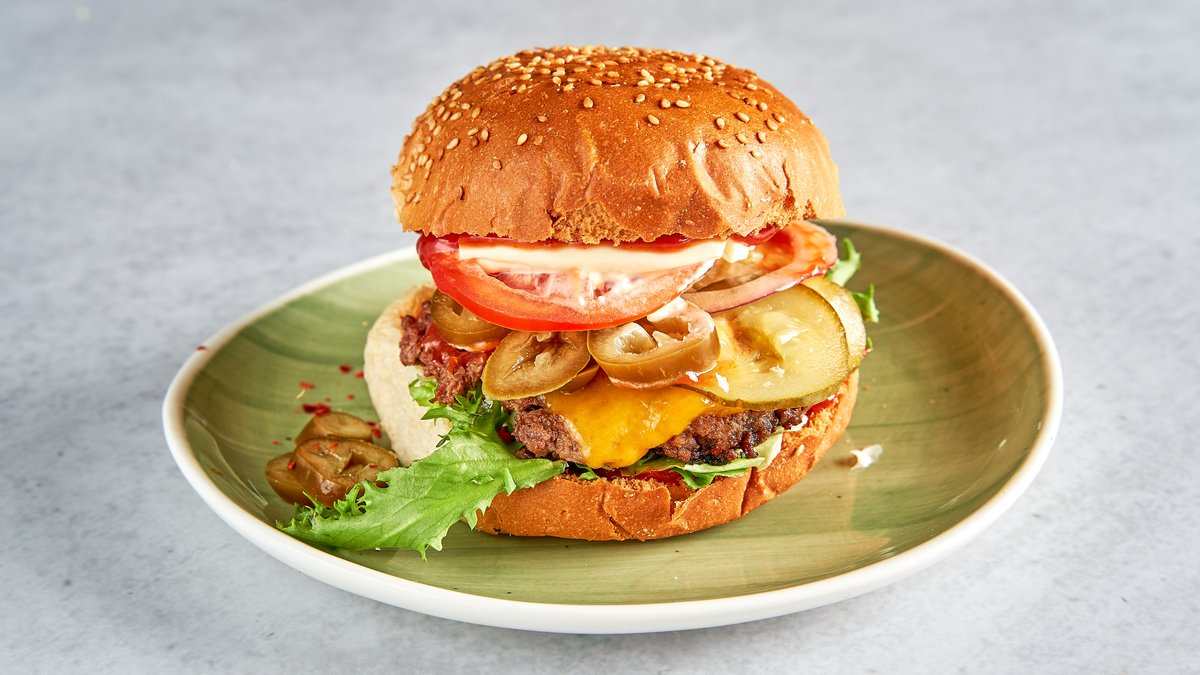 mit 125g Beef-Patty, Jalapeños, frischem Eisbergsalat, Tomaten, Röstzwiebeln und unsere hausgemachte Burger-Sauce