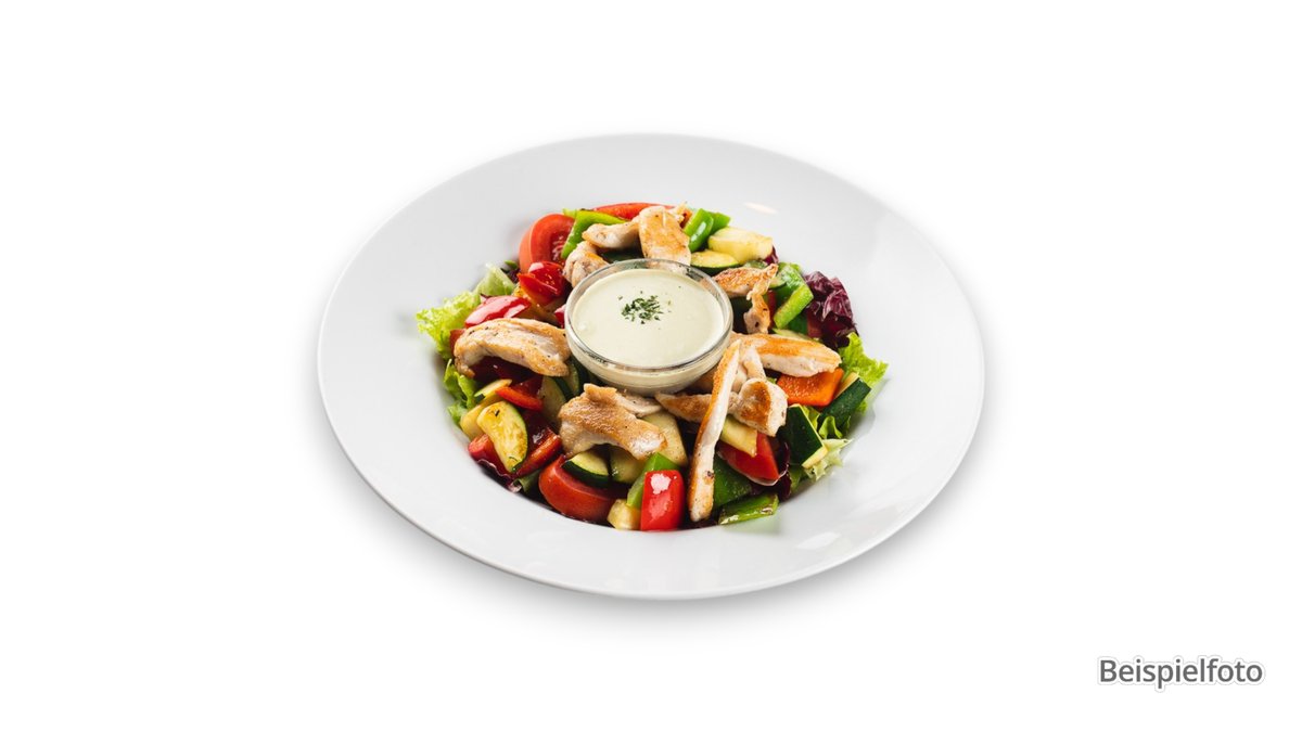 mit Eisberg, Tomaten, Gurken, Paprika, Krautsalat, Zwiebeln, Oliven, Peperoni und Putenfleisch
