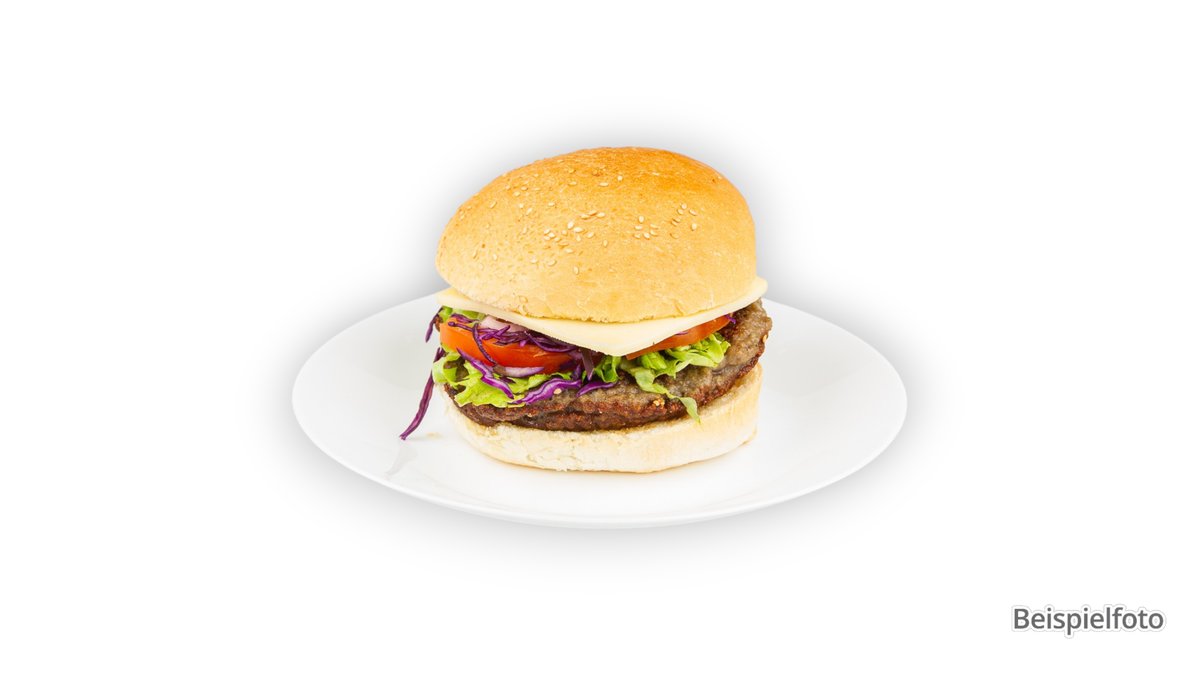 mit Rinderhack, Käse, Zwiebeln, Salat, Gurken, Ketchup und Senf