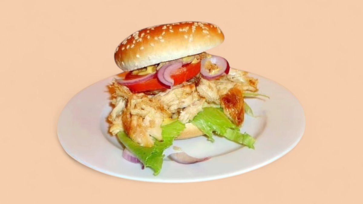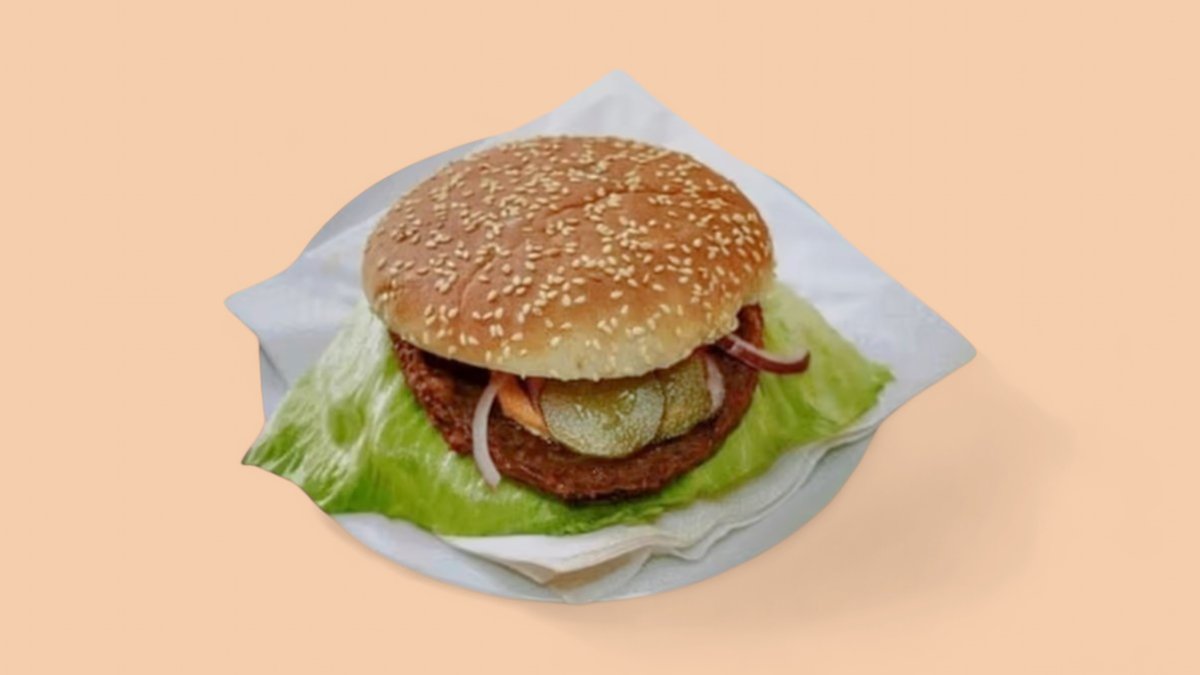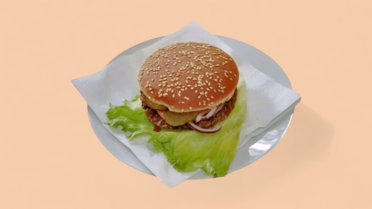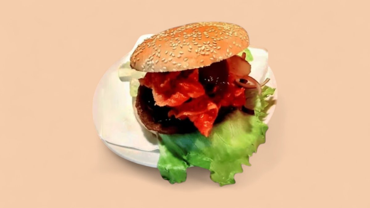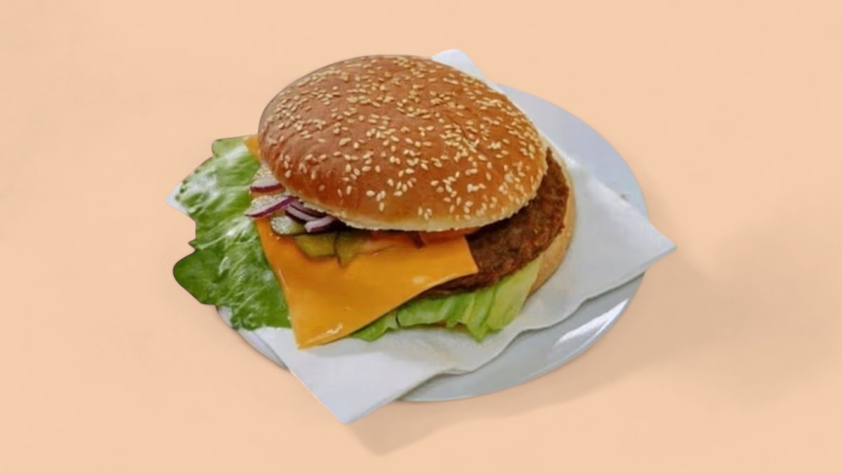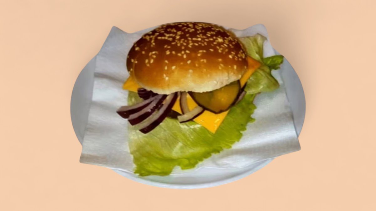saftiger Burger mit Salat, Zwiebeln und Gurken