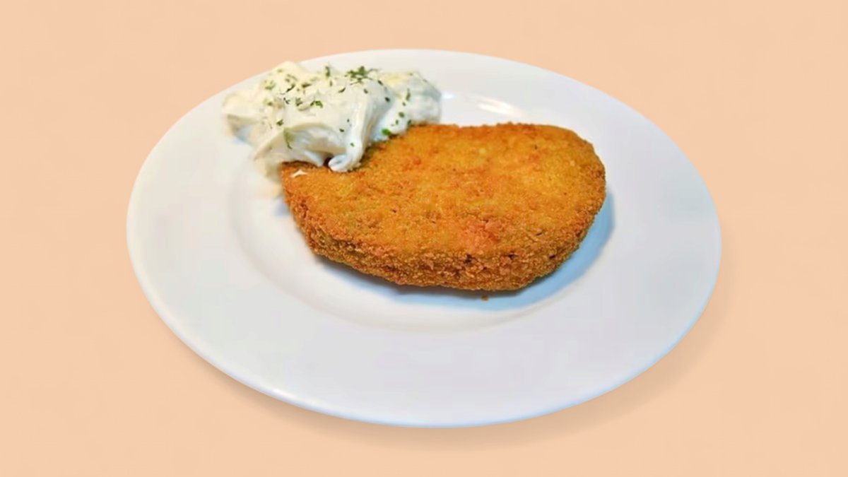 knusprig paniertes veganes Schnitzel mit Sauerrahm