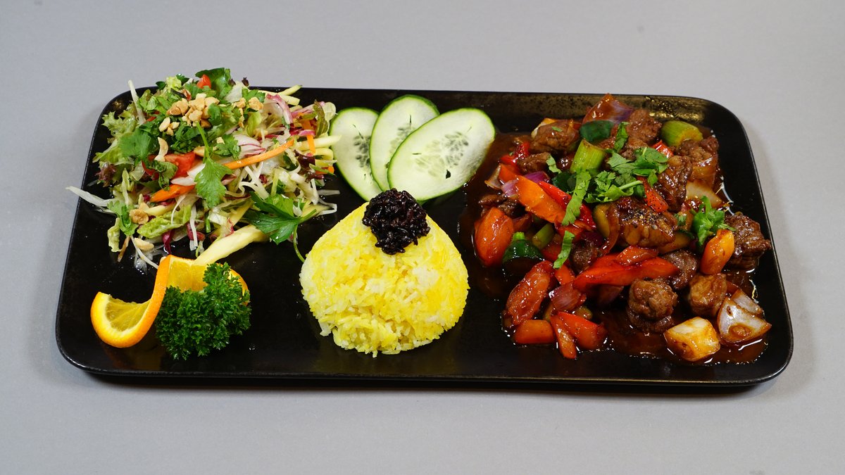 Zarte Rindfleischwürfel vom Entrecôte gebraten mit Gemüse der Saison nach LQ Art, serviert mit Reis
