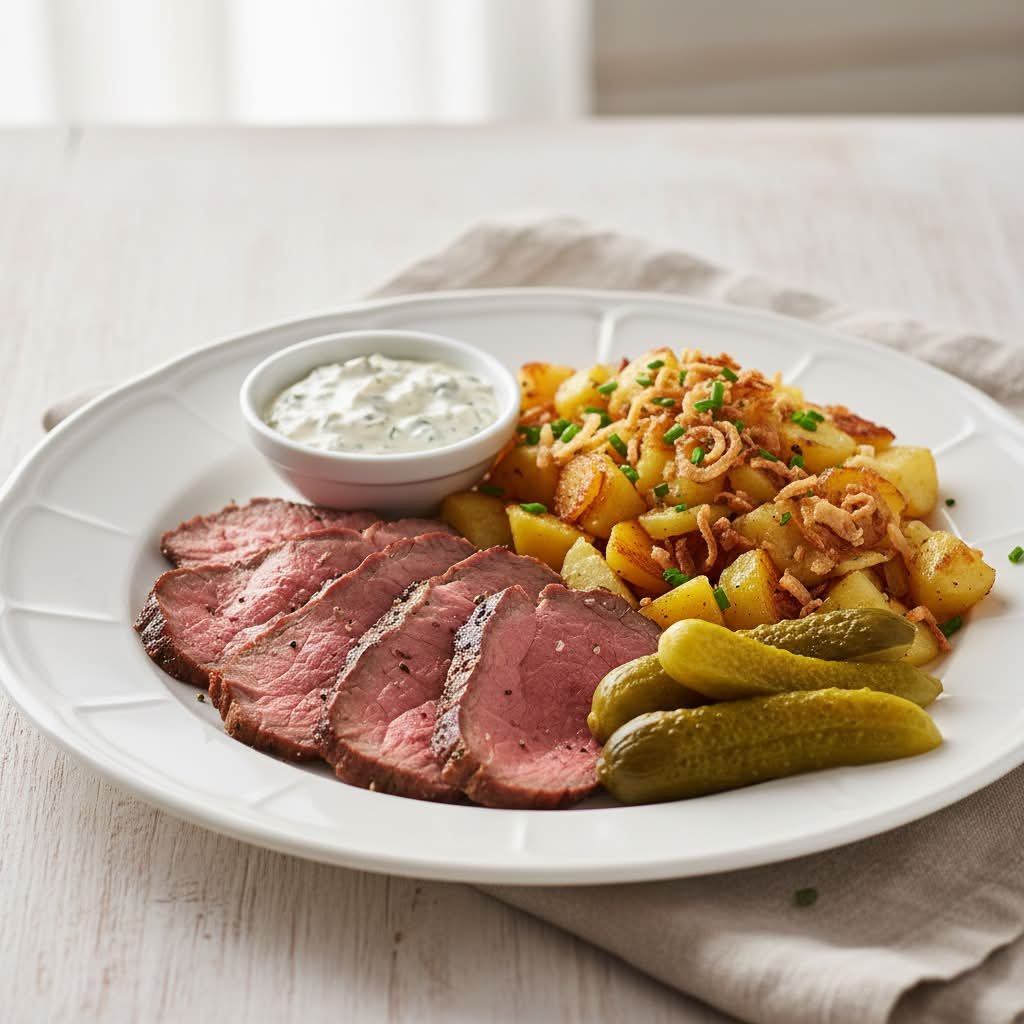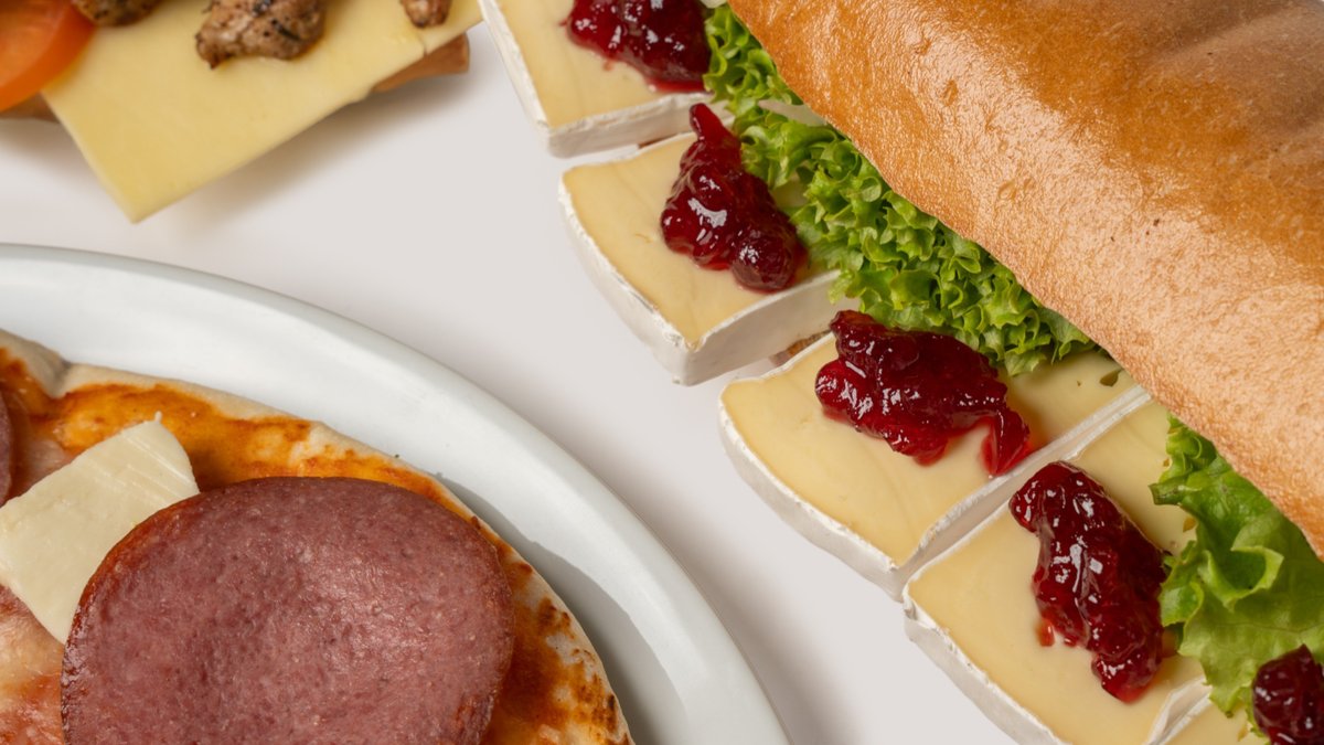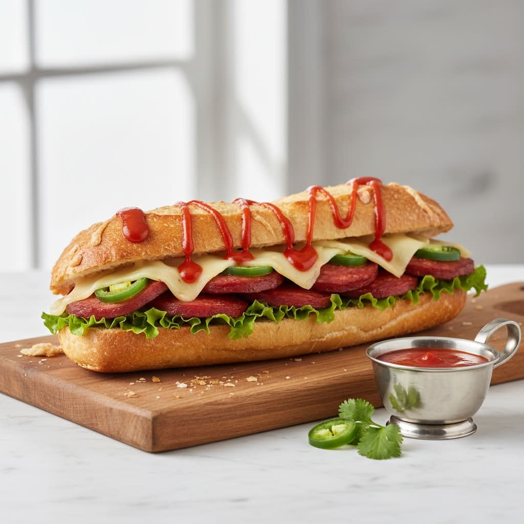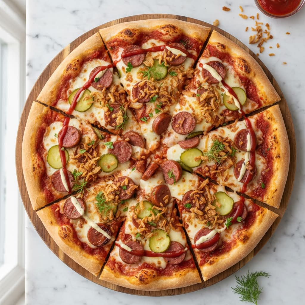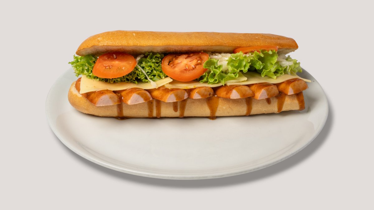 mit zarten Würstchenscheiben, eingelegten Gurken, Tomatenketchup, dänischer Remoulade, Röstzwiebeln, zartschmelzendem Mozzarella und Tomatensoße