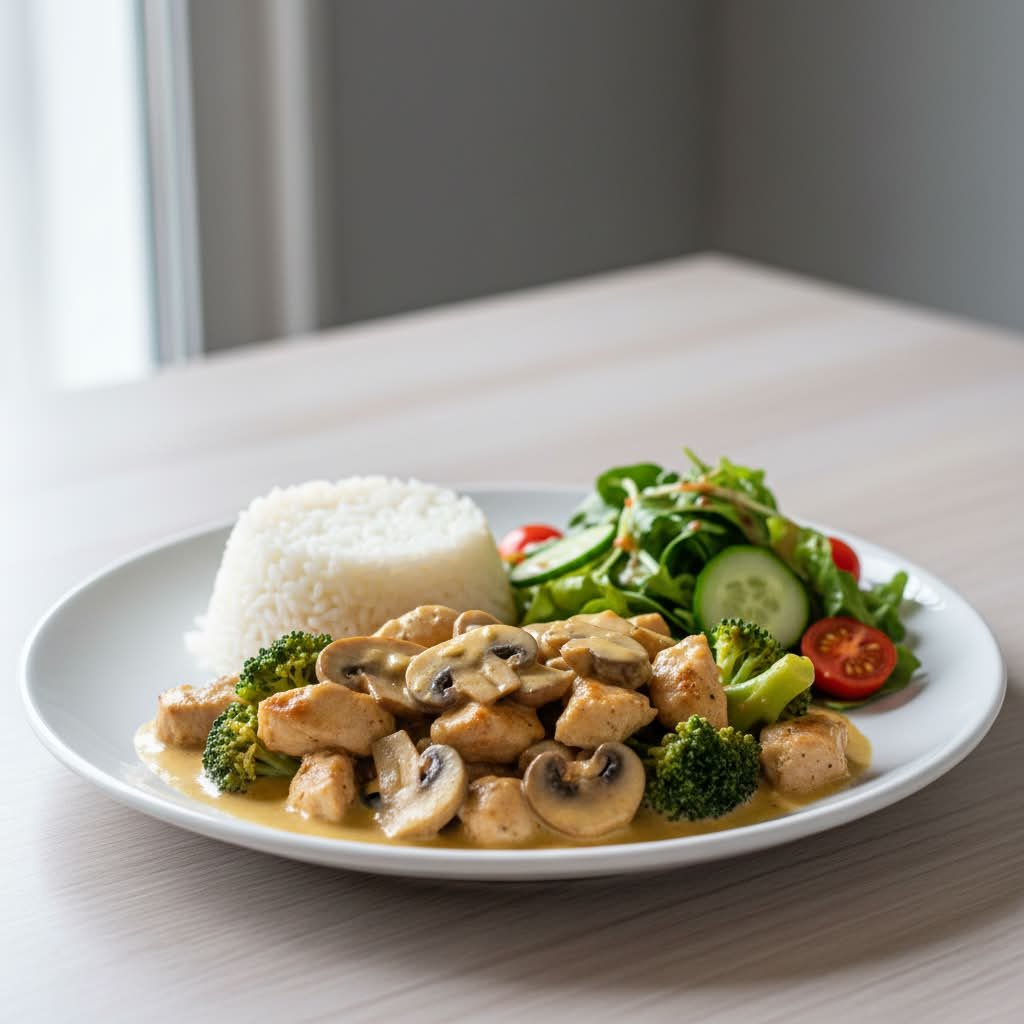 mit frischen Champignons, Hähnchenbrust-Streifen (flüssig gewürzt) und Brokkoli in einer cremigen Pesto-Sahnesoße