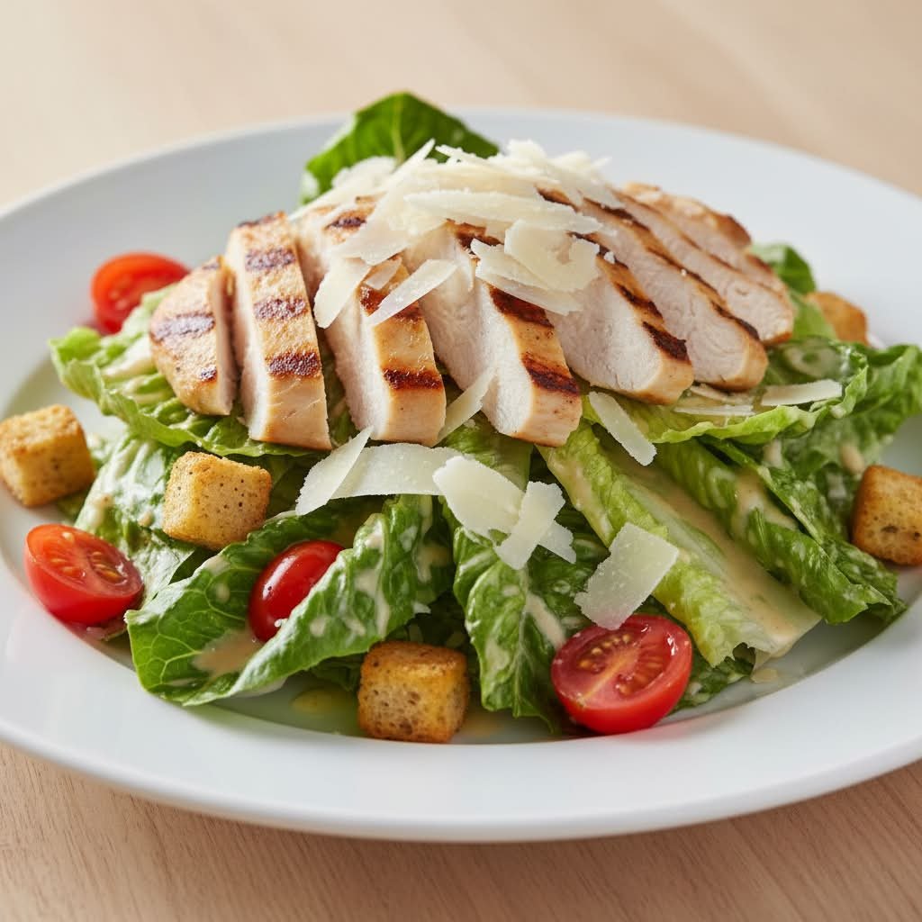 Römersalat mit aromatischen Kirschtomaten, Hähnchenbrust Streifen (flüssig gewürzt), Croutons und italienischem Hartkäse