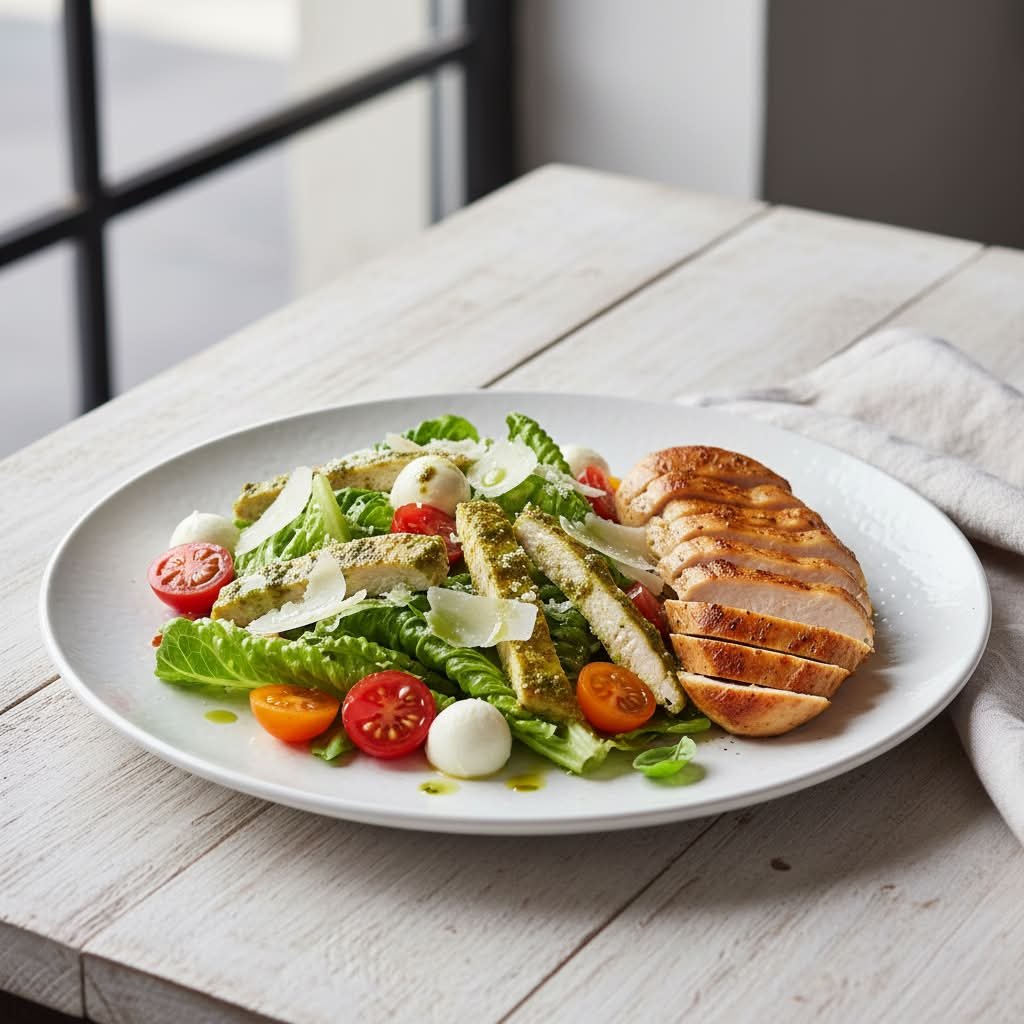 Römersalat mit Kirschtomaten, Mozzarella, in Basilikum-Pesto marinierten Hähnchenbrust-Streifen (flüssig gewürzt) und italienischem Hartkäse
