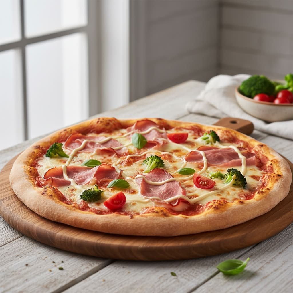 mit saftigem Hinterschinken (mit Würzlake), frischen Tomaten, Brokkoli, cremiger Sauce hollandaise, zartschmelzendem Mozzarella und Tomatensoße