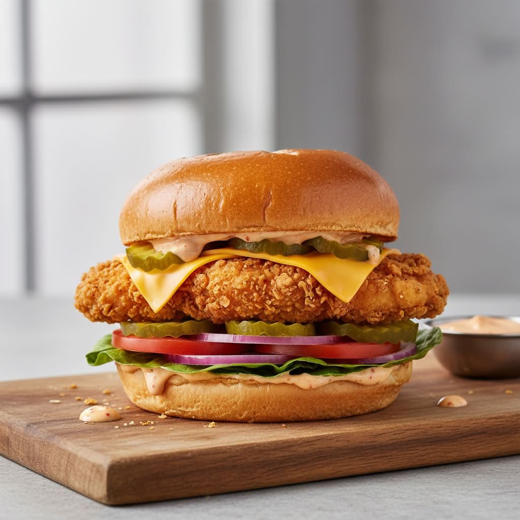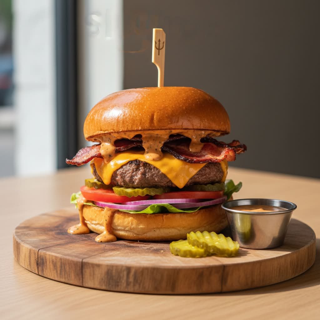 mit saftig gegrilltem Burger-Krümel (100 % Rind), roten Zwiebeln, eingelegten Gurken, frischen Tomaten, cremiger Burgersoße, zartschmelzendem Mozzarella und Tomatensoße