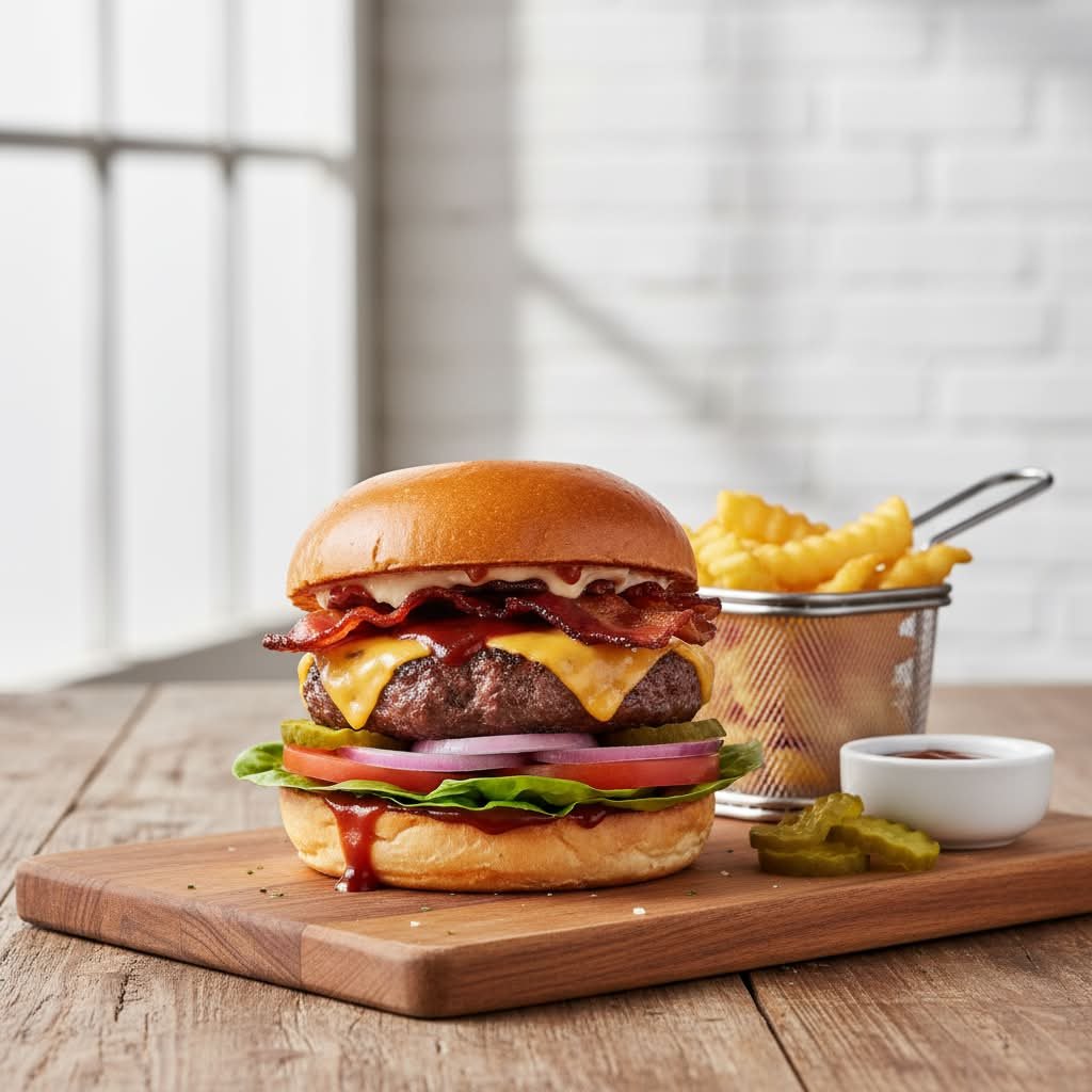 mit süß-rauchiger Barbecuesoße, saftig gegrilltem Burger-Krümel (100 % Rind), Speck, roten Zwiebeln, zartschmelzenden Mozzarellakugeln und Mozzarella