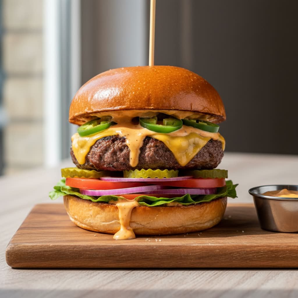 mit gesalzenen Doritos, saftig gegrilltem Burger-Krümel (100 % Rind), feurigen Jalapeños und cremiger Käsesoße