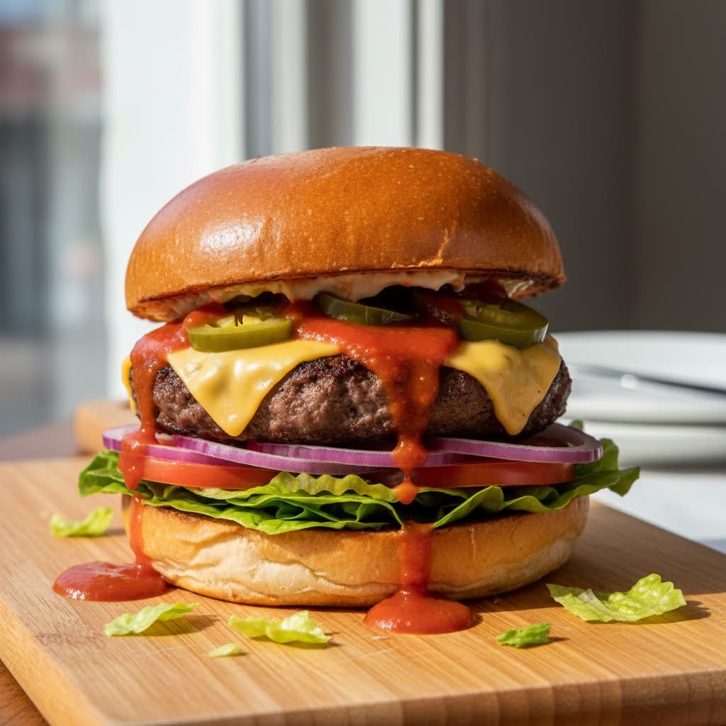 mit fein-würziger Tomatensauce, gesalzenen Doritos, saftig gegrilltem Burger-Krümel (100 % Rind), feurigen Jalapeños