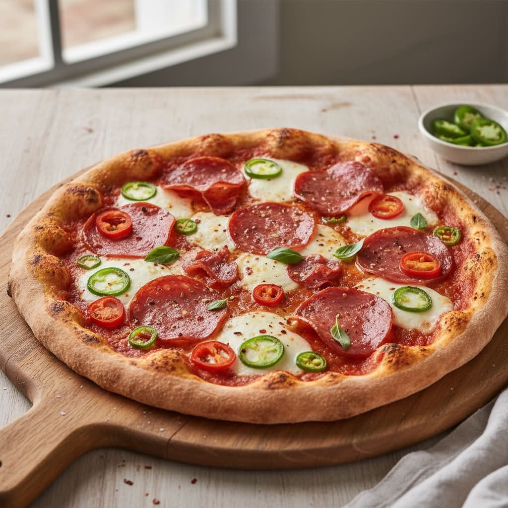 mit würziger New York Style Salami, fein-würziger Salami, feurigen Jalapeños-Mix, zartschmelzendem Mozzarella und Tomatensoße