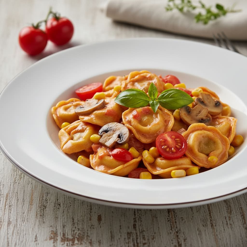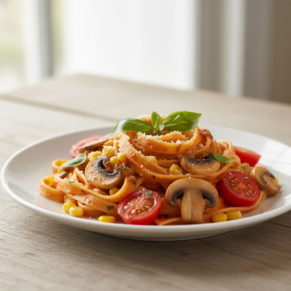 mit frischen Champignons, Mais und aromatischen Kirschtomaten in cremig fruchtiger Tomaten-Sahnesoße
