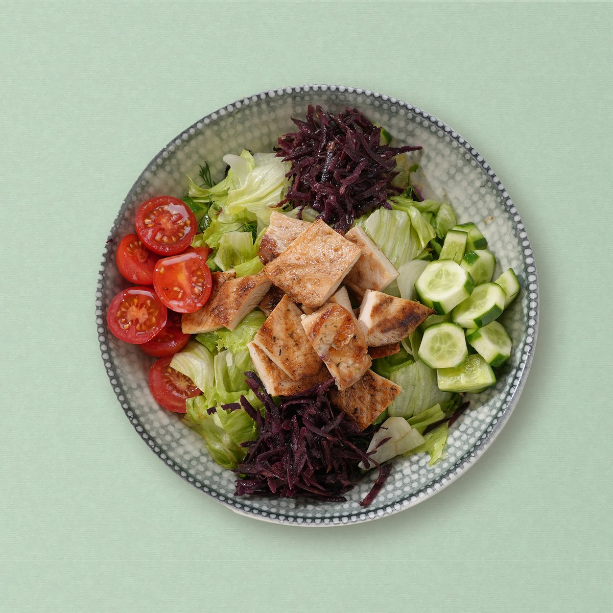 Gegrilltes Hähnchenbrustfilet, Gurken, Tomaten, Blattsalate, Lila Karotten, Dressing