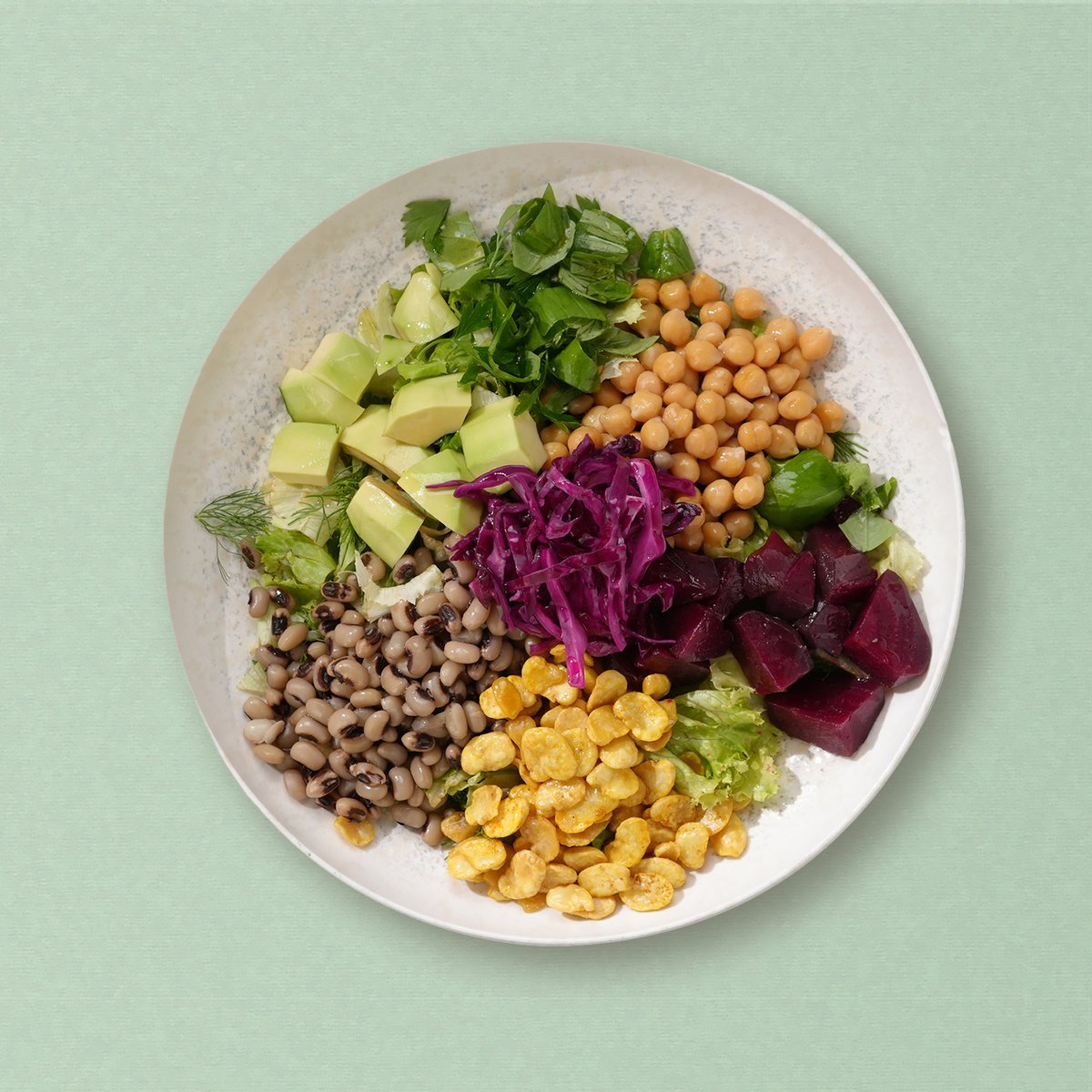 Kichererbsen, Rote Bete, Avocado, Rotkohl, Augenbohnen, frittierte Ackerbohnen, Blattsalate, Dressing
