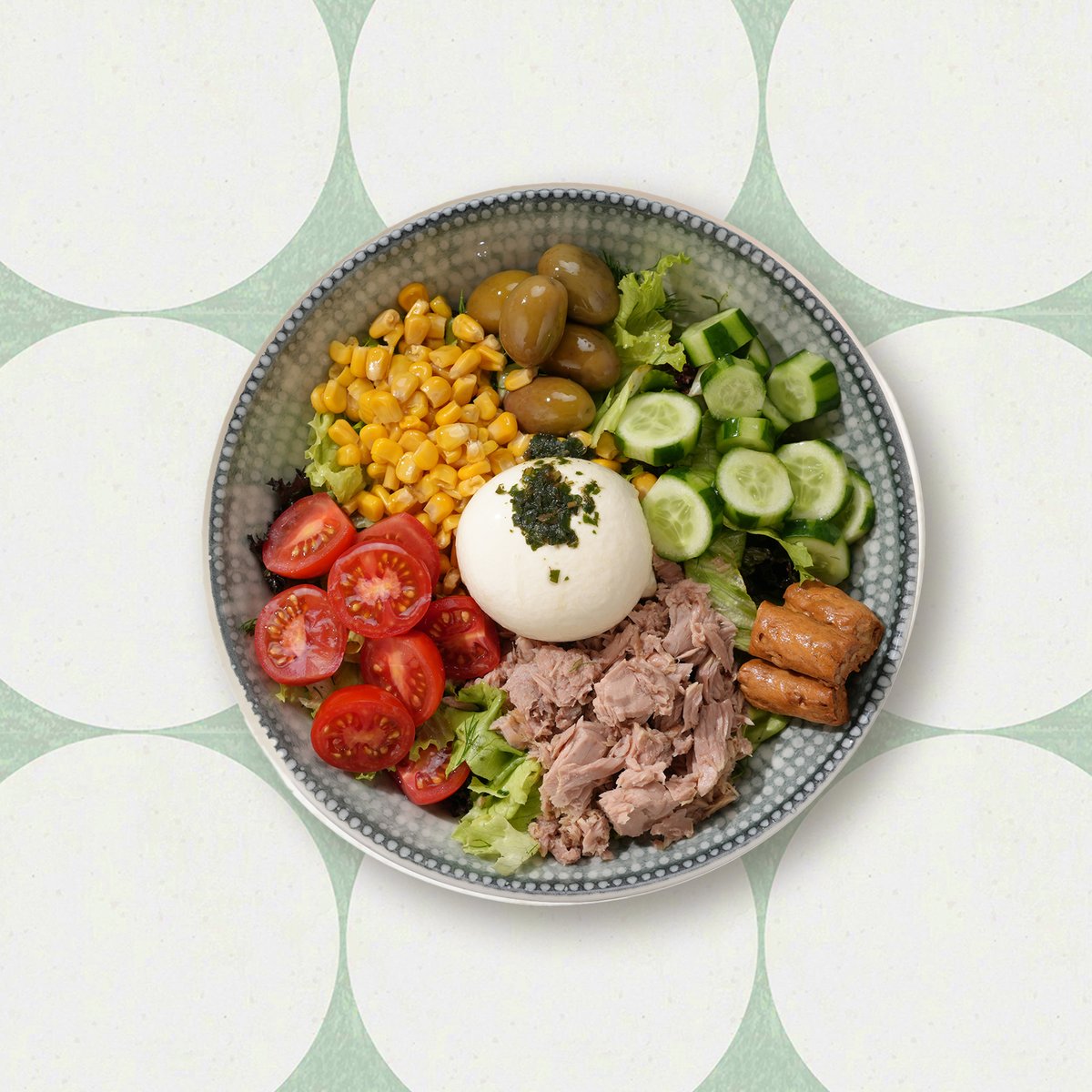 Mozzarella, Thunfisch, Tomaten, Gurken, Mais, Grüne Oliven, Brotsticks, Blattsalate, Dressing