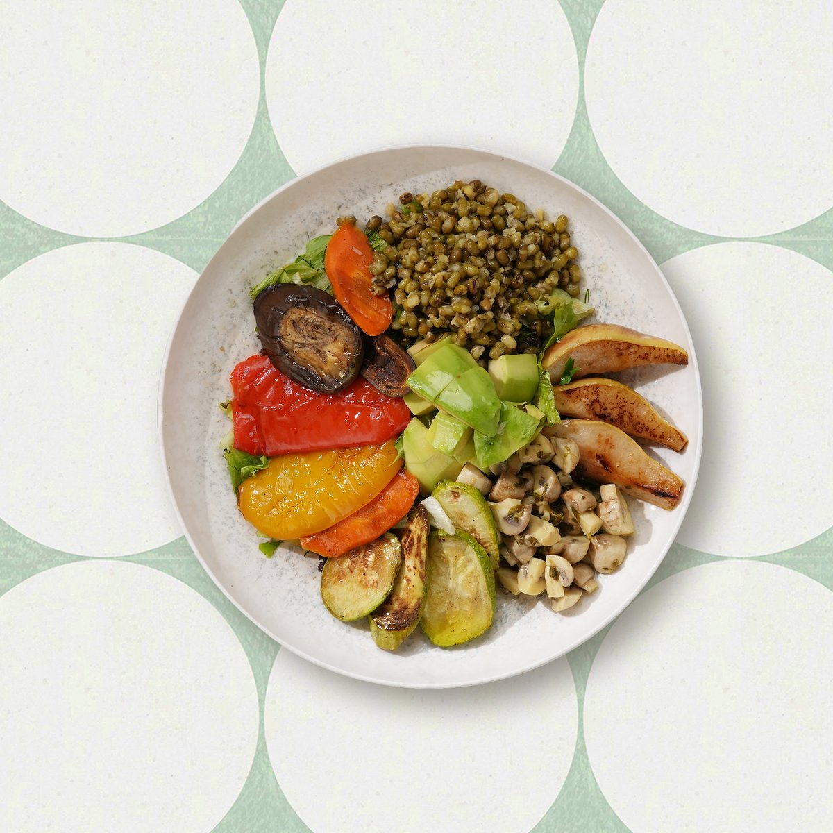 Avocado, Champignons mit Zitrone, Zucchini, Paprika, Karotten, Auberginen, Mungbohnen, gebackene Birnen, Blattsalate, Dressing