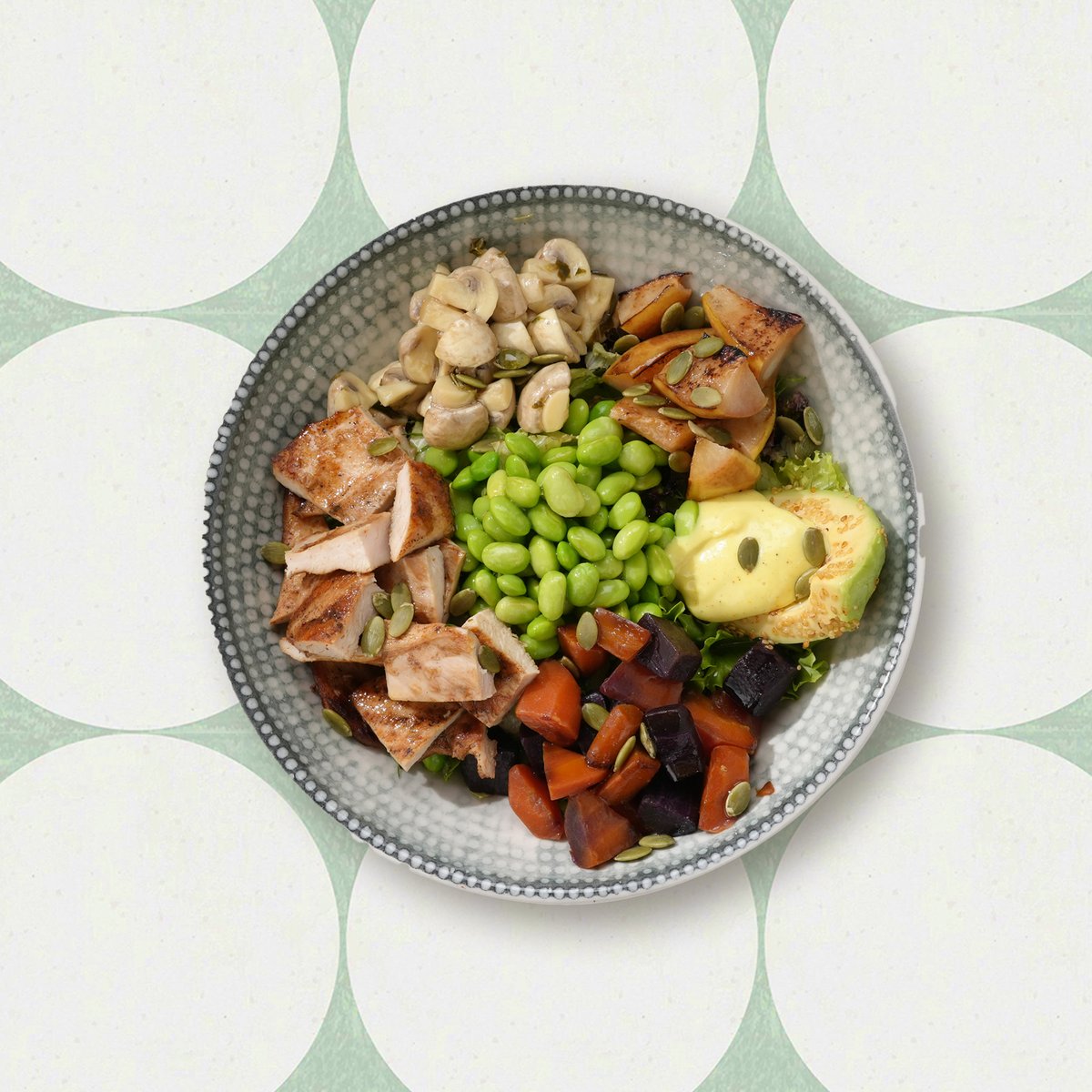 Gegrilltes Hähnchenbrustfilet, gebackene Birnen, Karotten, Champignons, Edamame, Kürbiskerne, Rote Bete, Avocado, Blattsalate, Dressing