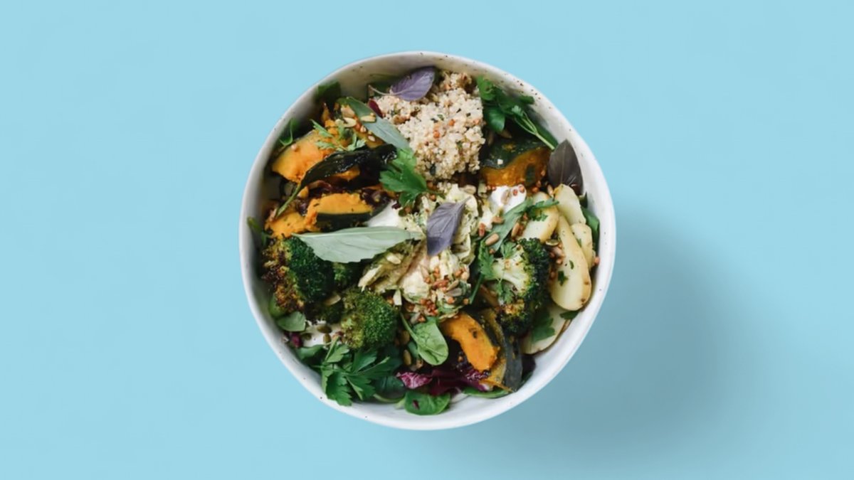 mit blattsalat, tahinidressing, süßkartoffel, reis, brokkoli, nordic kimchi, tempeh, mandel chili öl, koriander