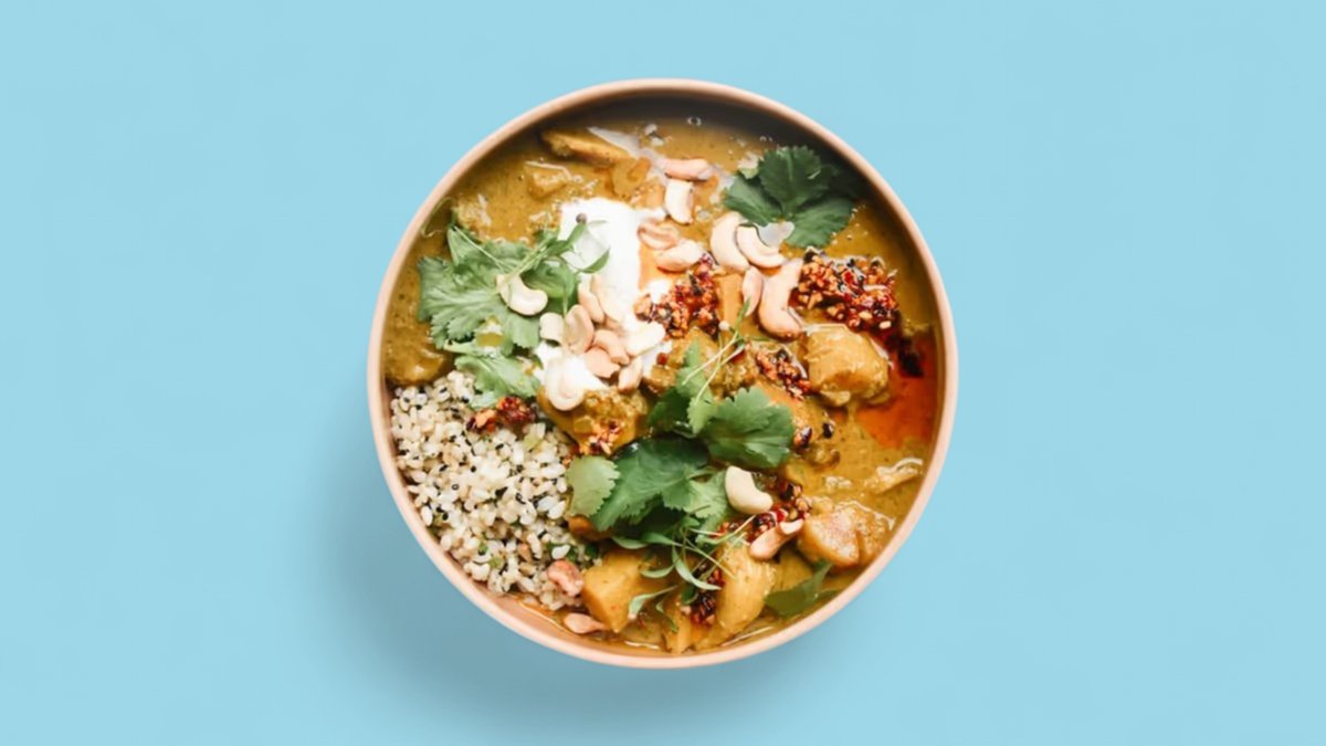 mit reis, schalotten chutney, cashew joghurt, mandel chili öl, koriander kresse, koriander, knoblauch
