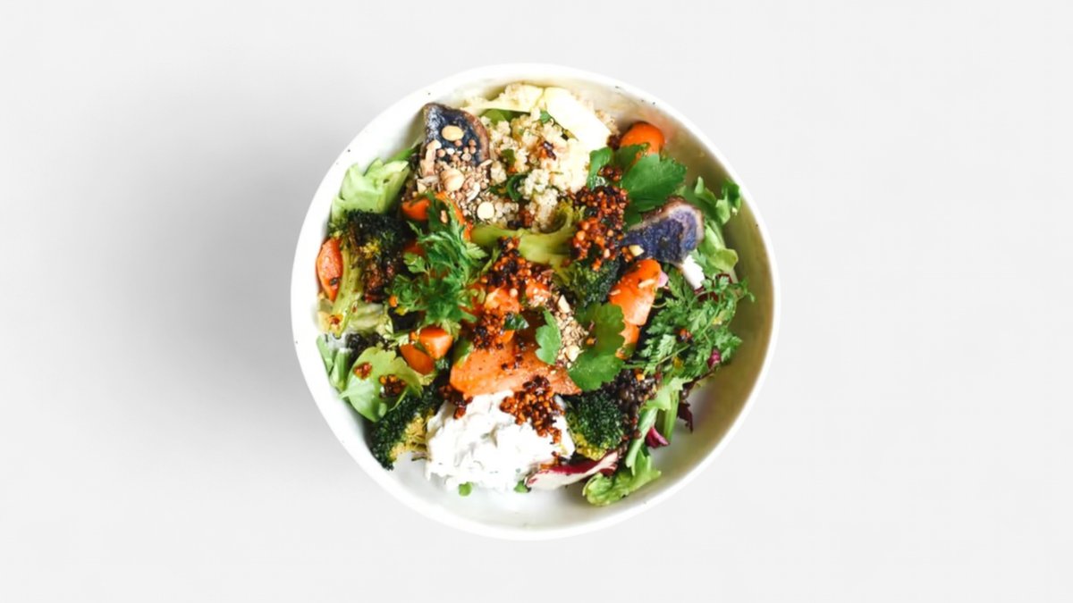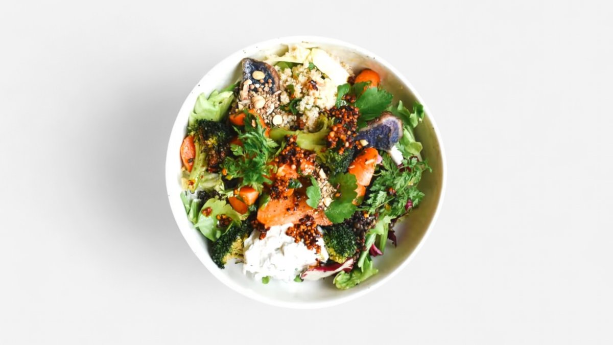 mit Blattsalat, Kräuteröl, Quinoa, Süßkartoffel, Linsen, Karotten, Brokkoli, Kräuterquark, Tahini, Mandel Chilli Öl, Kräutermix und Dukkah