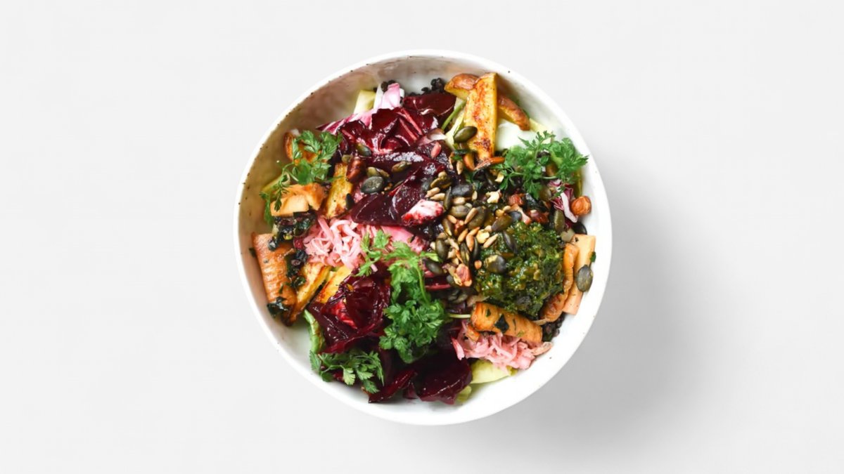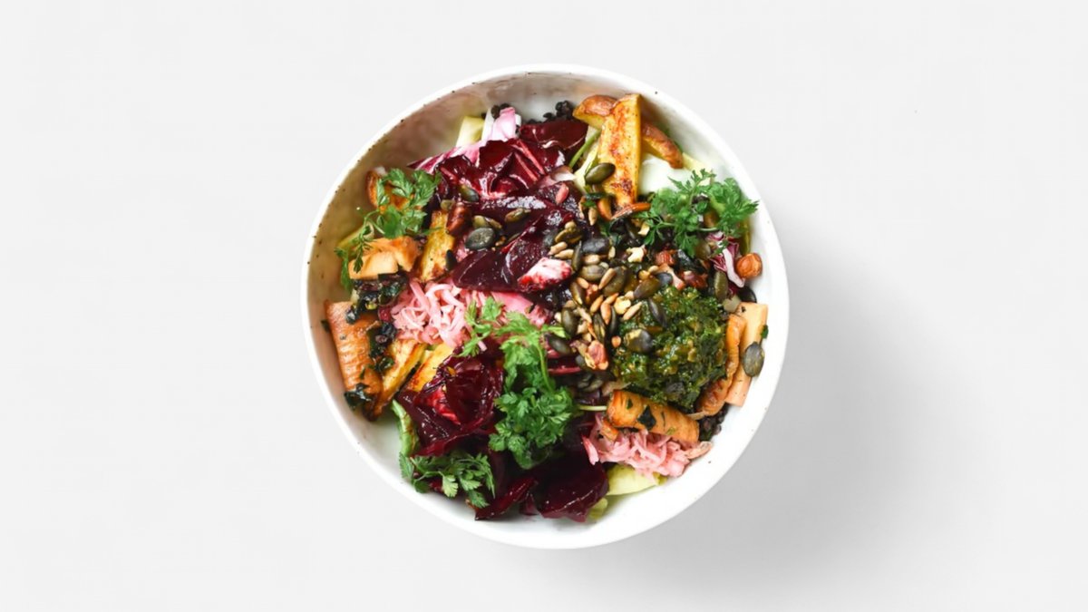 mit Blattsalat, Olivenöl, Belugalinsen, Kartoffeln, Coleslaw, Rote Beete, Pastinake, Kürbiskernpesto, Joghurt Estragon, Kräutermix, Herzhaftes Granola