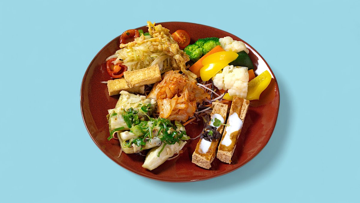 for 2 people with crispy tofu, vegan papaya salad, grilled eggplants and steamed seasonal vegetables