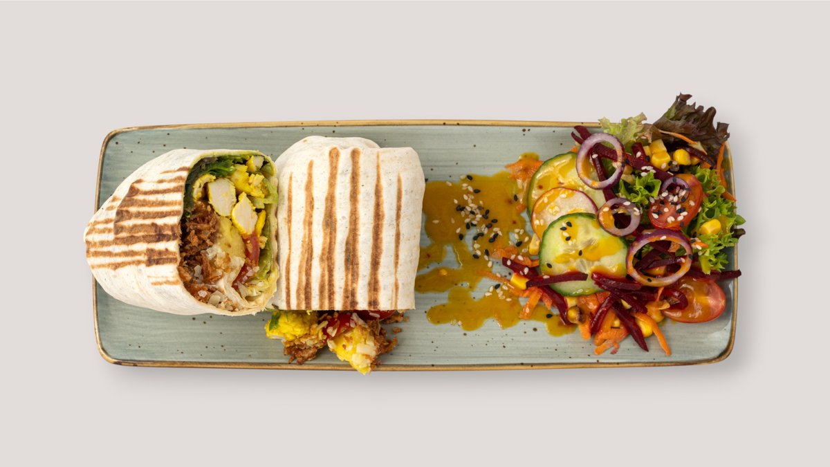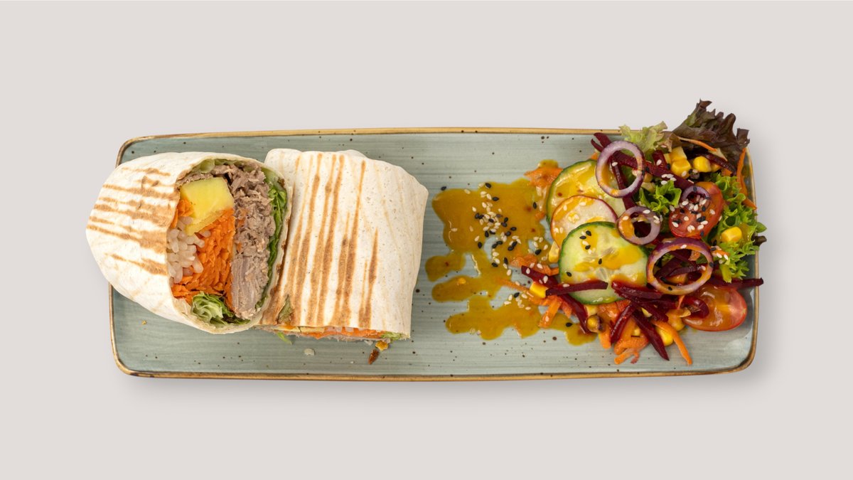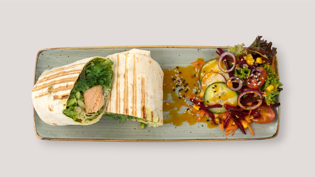 with spicy chicken, cucumbers, tomatoes, goma wakame, fried champignons, coriander, fried onions and Parmesan cheese
